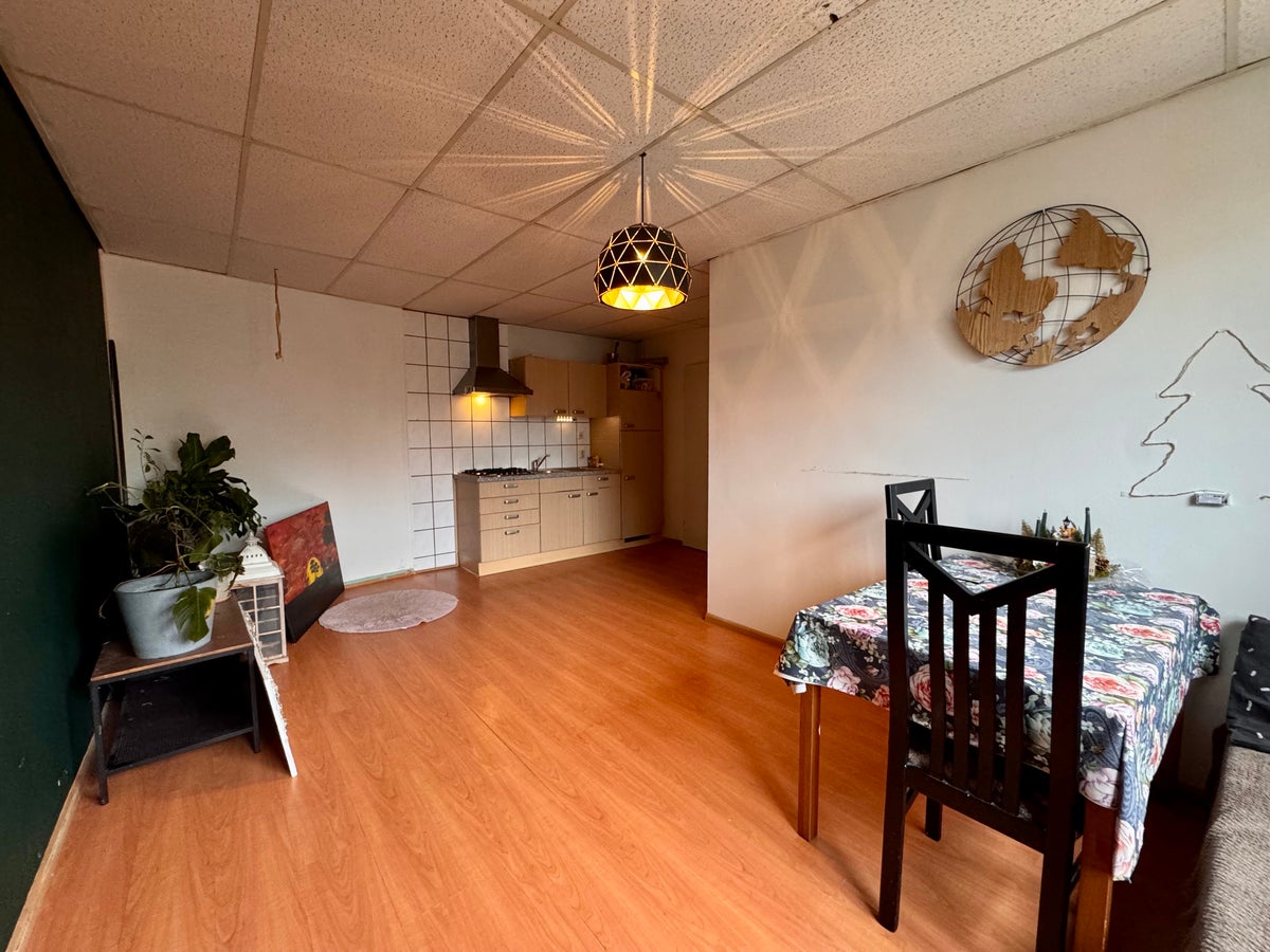 Ruime woonkamer met open keuken. De keuken is voorzien van een koelkast, diepvries, magnetron, spoelbak, gas kookplaat en afzuigkap.