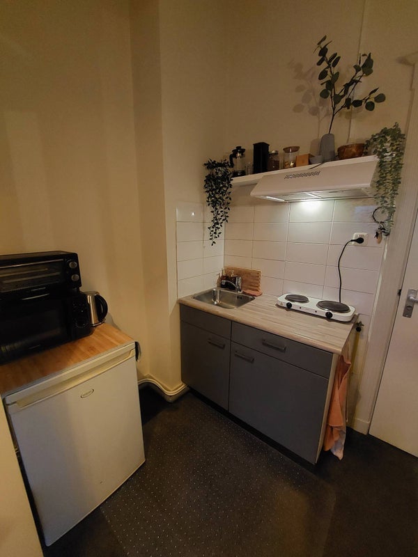 Te huur: studentenkamer op de begane grond met eigen keukenblok en wastafel.