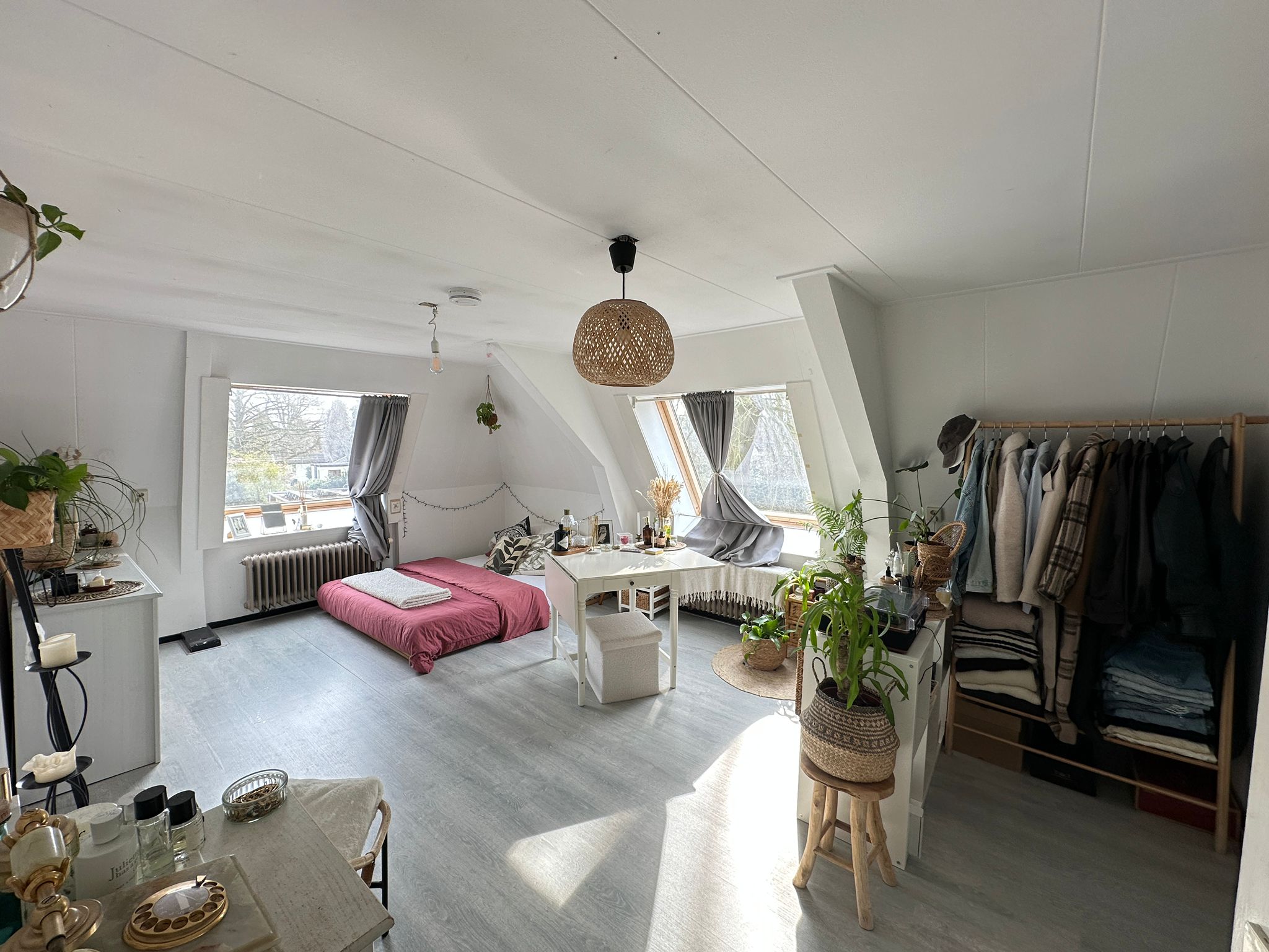 Het betreft de kamer op de tweede verdieping van een monumentale villa in Hilversum.We zitten met 10 mensen (gemengd) in dit huis, dat klinkt veel en heftig maar het valt mee. Op de begaande grond zitten vier kamers en die delen een toilet, douche en keuken. Op de eerste etage wonen drie meiden en op de tweede etage wonen twee jongens en een meid. De meid op de tweede etage vertrekt en die kamer komt dus vrij.