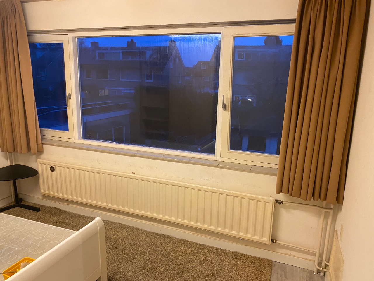 De kamer heeft een schuine wand, maar ook een inloopkast! De vloer en gordijnen zijn over te nemen tegen geen vergoeding. Er bevinden zich een gezamenlijke woonkamer, een keuken, 1 badkamer en 2 wc’s in het huis. Hiernaast hebben we beneden ook nog een fietsenstalling/opberghok.Lijkt het jouw leuk om in dit huis te wonen? Reageer dan snel op deze advertentie en vertel wat leuks over jezelf. Een foto zien we ook graag