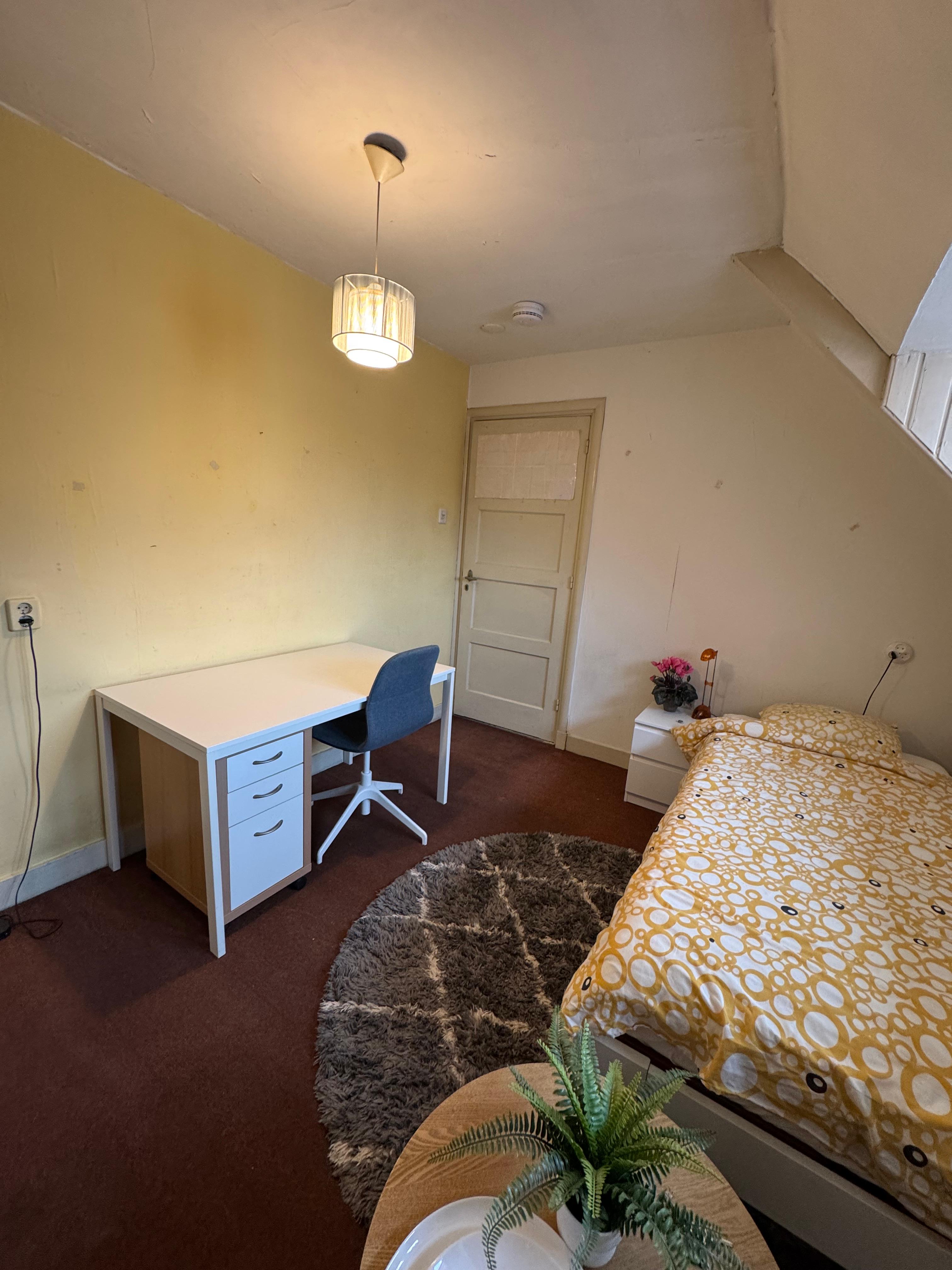 The room is 15m2 . The room is furnished and provided with fridge, microwave, bed, desk, TV, couch, closets and a sink with hot and cold water. Furthermore, the house has a kitchen, bathroom with toilet, seperate toilet, roofterrace and garden, which are shared by 5 other international students and expats. The price is € 640eu per month INCLUDING a payment for gas, water and electricity and furniture.We are looking for someone who is excellent at keeping the room clean.Registration is possible.