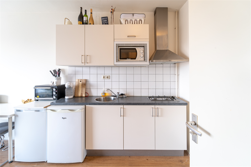 Indeling: Gezamenlijke entree met een lift die toegang biedt tot de betreffende etage van de studio. Bij binnenkomst tref je de keuken welke beschikt over diverse faciliteiten zoals een 2-pits kookplaat, magnetron en koelkast. De badkamer is voorzien van een toilet, douche en wasbak. Verder is de gehele studio voorzien van een nette laminaatvloer, beschikt het over verduisterende gordijnen welke niet vervangen mogen worden en beschikt de studio over een (klein) balkon.Bereikbaarheid: Het complex Utopia is eenvoudig te bereiken middels het openbaar vervoer, de fiets of de auto.