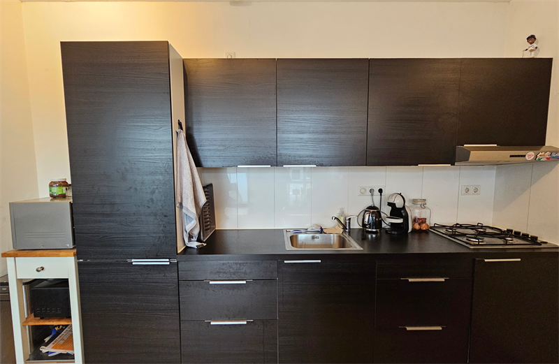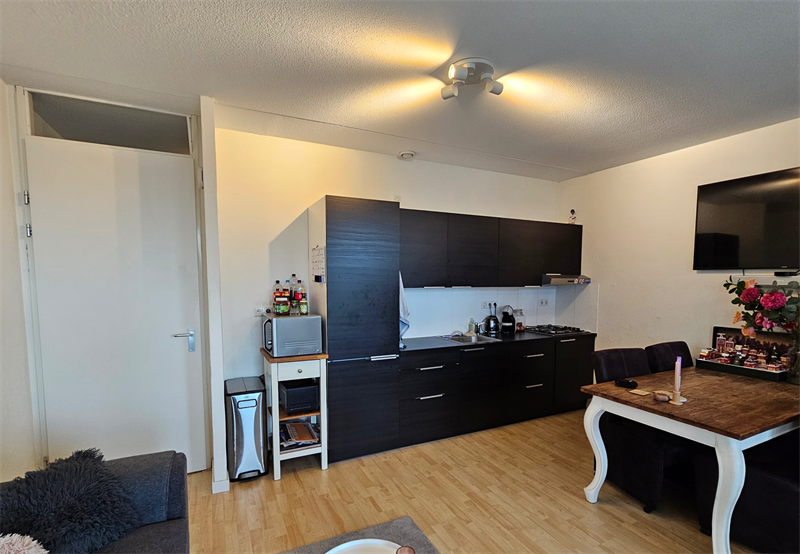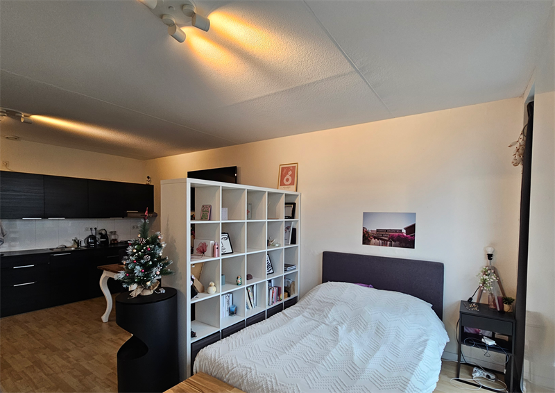 Via de voordeur bereik je de gang met aan de linkerzijde de badkamer. De badkamer is voorzien van een douche, wasbak, toilet en wasmachine aansluiting. Vervolgens bereik je via de hal de ruime woon/slaapkamer met open keuken. De keuken is voorzien van een koelkast, vrieskast, kookplaat, afzuigkap en voldoende kastruimte.