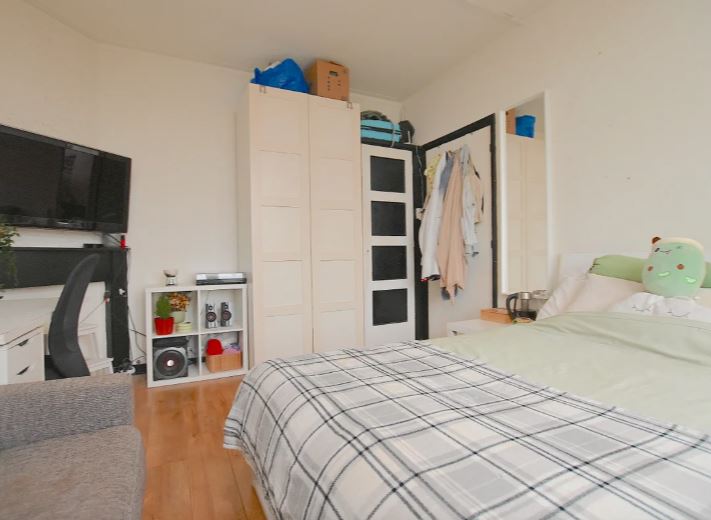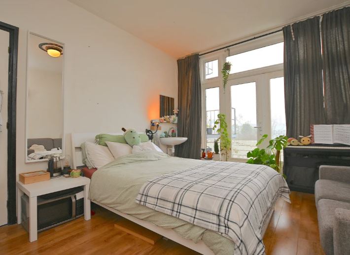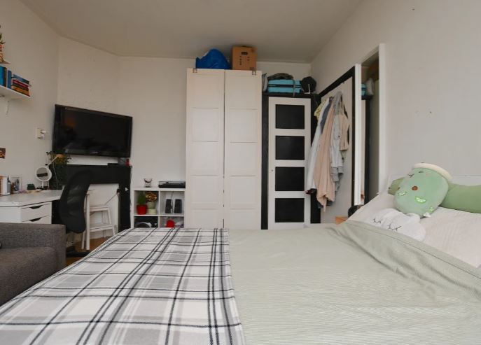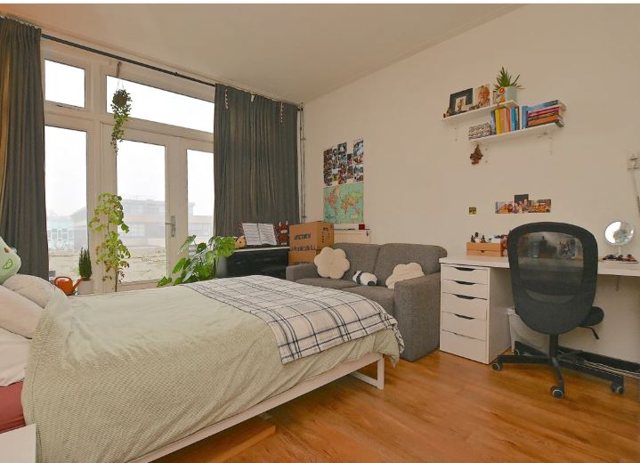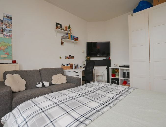 Daarnaast beschikt de kamer over een eigen wastafel. De kamer heeft genoeg plek voor een 2-persoonsbed, bureau en een 2-zits bank. De kamer heeft zijn eigen ingebouwde kast. De keuken, douche en het toilet worden gedeeld met vier huisgenoten.