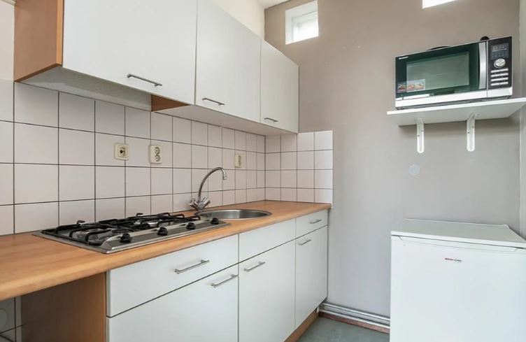 Tweede verdieping Op de tweede verdieping ligt de eigen voordeur met op de gang de meterkast. Woon-/slaapkamer met veel lichtinval en voorzien van rolgordijnen. In een nis is een ruime keuken met voldoende opbergmogelijkheid. Gaskookplaat, koelkast, magnetron en wasmachine zijn aanwezig.