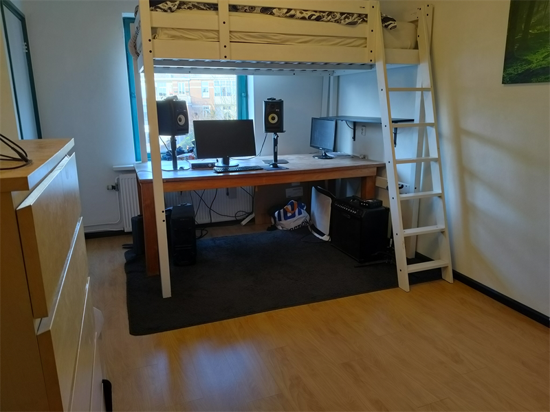 De huur bedraagt 725 euro. Dit betreft de kamer, gezamenlijk te gebruiken gemeubileerde woonkamer (20m²), badkamer, keuken, groot balkon, kelder/opslag en wasmachine. Huurprijs is inclusief gas, water, licht en wifi. Verder is de hoogslaper te zien op de afbeelding ook vrij voor overname als hier intresse in is.