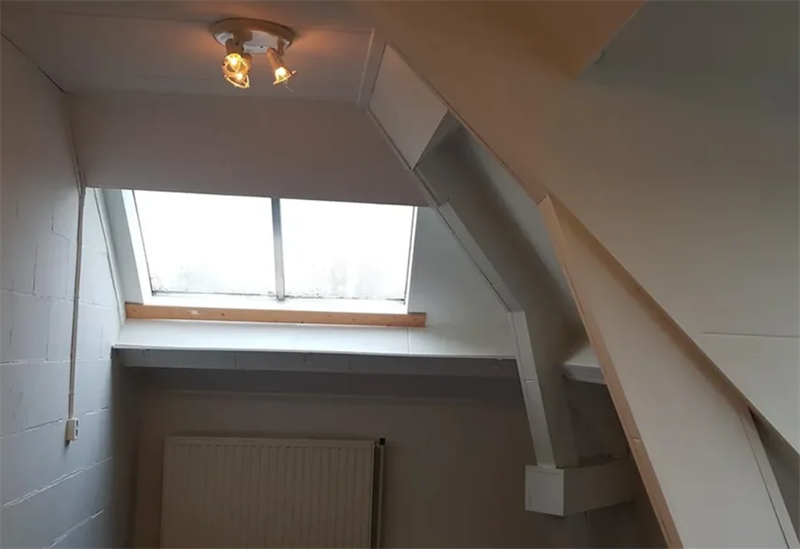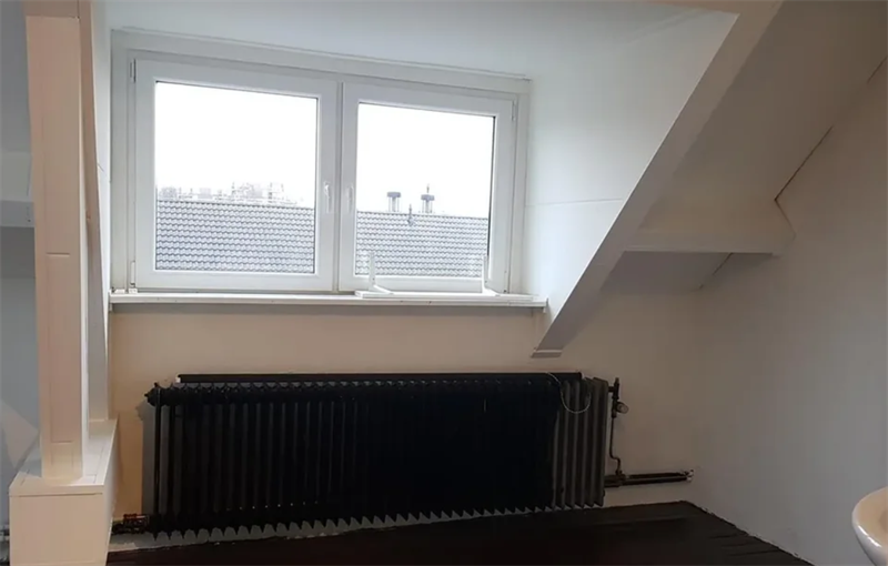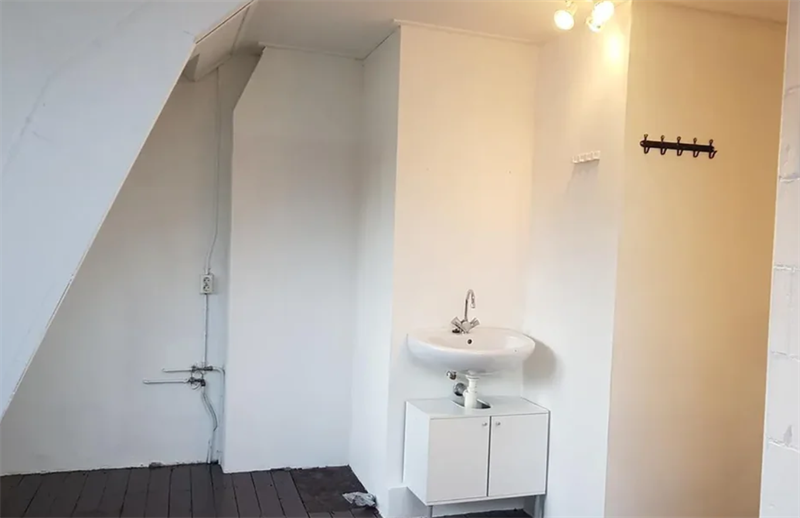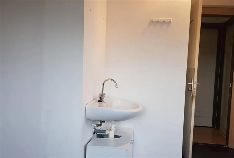 Kamer met eigen wastafel en laminaatvloer op de derde etage in een studentenhuis.