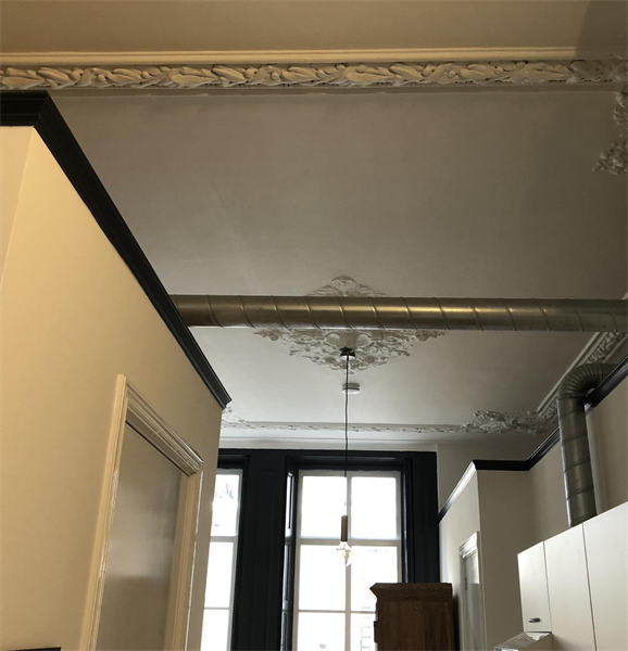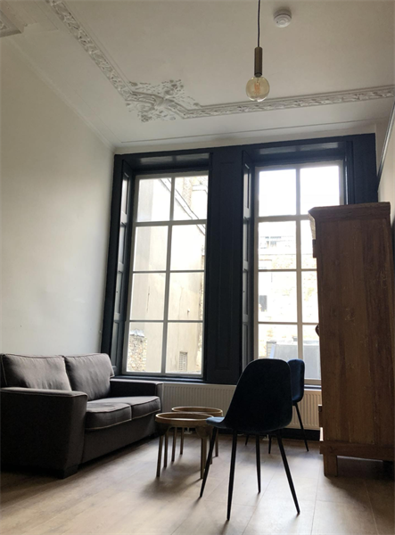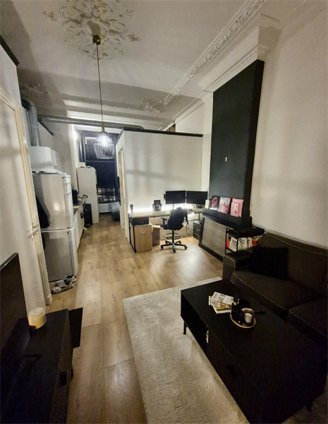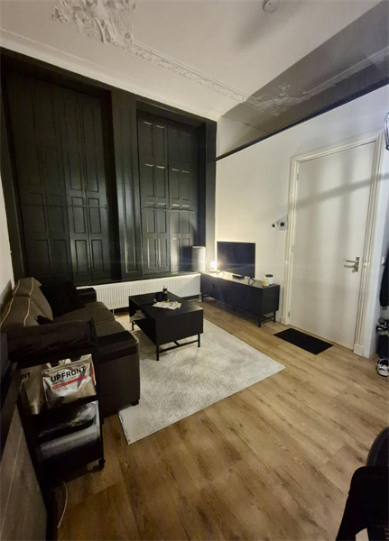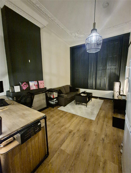 Woonkamer met open keuken in een rijksmonument ! Met monumentale plafonds Super de super mooi met authentieke details Woning is gemeubileerd Recent geheel ontwikkeld Mooie badkamer geheel betegeld met douche met thermostaat en badmeubel en wasmachine .