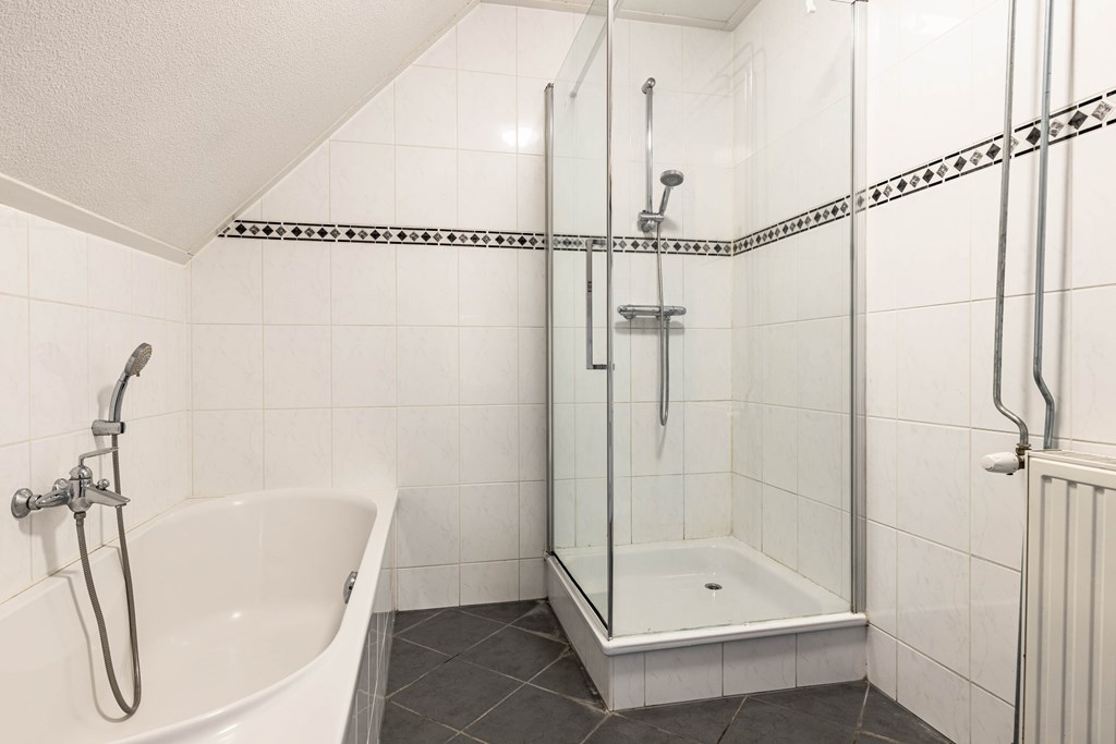 Op de verdieping komt men gelijk in de algemene keuken met inductiekookplaat en cv opstelling. Aan de linkerzijde is een hal welke leidt naar kamer 2 (6.2 m) en kamer 3 (10.3 m). Aan de rechterzijde van deze algemene keuken is een hal welke leidt naar de gemeenschappelijke badkamer met bad, aparte douche, toilet en wastafel en de algemene woonkamer met keuken met inductiekookplaat. Via deze algemene woonkamer van maar liefst 27.8 m2 komen we bij de laatste twee kamers.