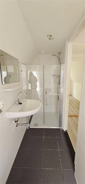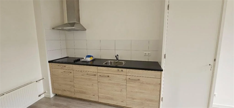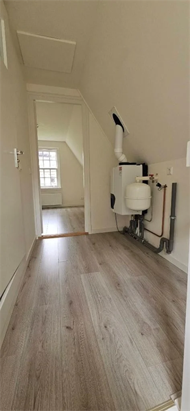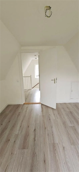 De badkamer is voorzien van een zwevend toilet, een afsluitbare douche, een wastafel en een radiator. De gehele woning is afgewerkt met een lichte laminaatvloer, wat zorgt voor een frisse en moderne uitstraling..