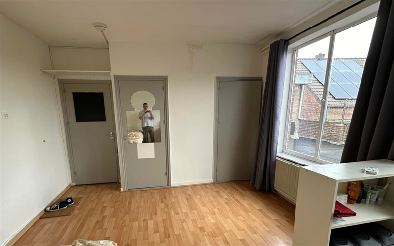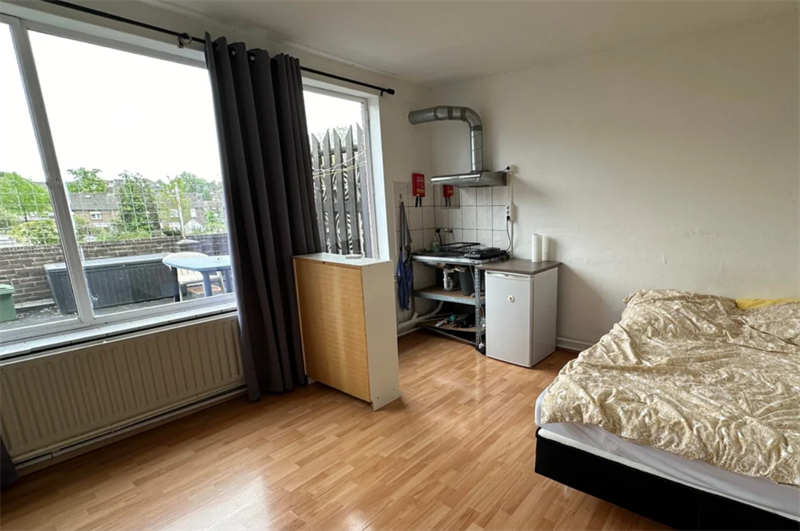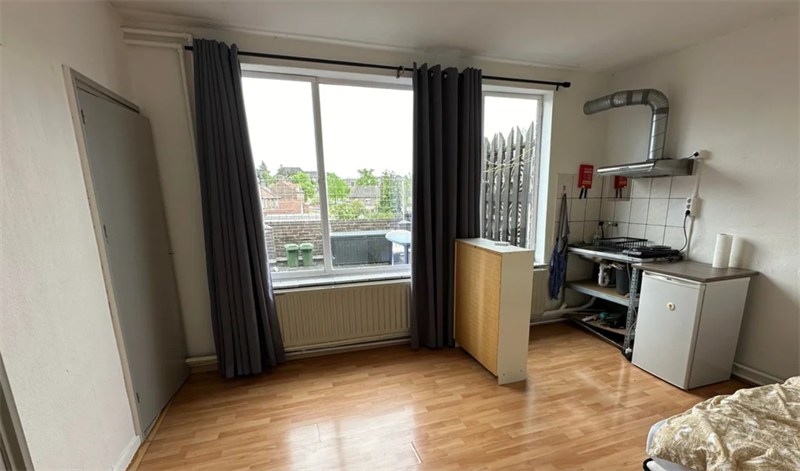 20m2 groot en beschikt over een eigen keuken. Er zijn meerdere badkamers en toiletten in het huis welkde gedeeld worden met andere huurders.