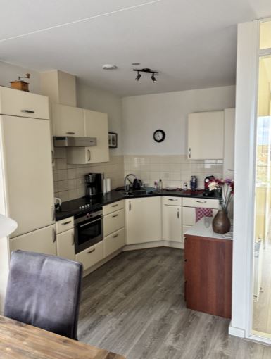 voorzien van spoelbak, koelkast, afzuigkap, kookplaat en voldoende kastruimte; Woonkamer; Slaapkamer 1 met schuifdeur naar badkamer;Deels betegelde badkamer voorzien van inloopdouche, vaste wastafel, wandcloset; Separate, deels betegelde toiletruimte voorzien van toilet en fonteintje; C.v.-/bergruimte, opstelling c.v.-ketel en aansluiting wasapparatuur; Slaapkamer 2 aan de voorzijde..