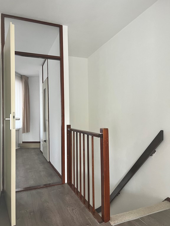 De indeling van dit 2 slaapkamer appartement is als volgt: Eerste woonlaag, gelegen op de eerste verdieping: U treedt de woning binnen in de hal, vanwaar u toegang heeft tot het toilet, de woonkamer en eveneens trapopgang naar de bovenverdieping. Het appartement beschikt over een ruime woonkamer (ca. 30 m²) met aangrenzend de half-open keuken.De woonkamer geniet van veel lichtinval door de grote raampartij aan de voorzijde vanwaar men eveneens het balkon kan bereiken. Het appartement is uitgevoerd met een nette keukenopstelling, zonder verdere apparatuur (m.u.v.