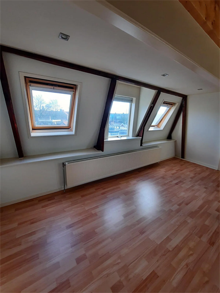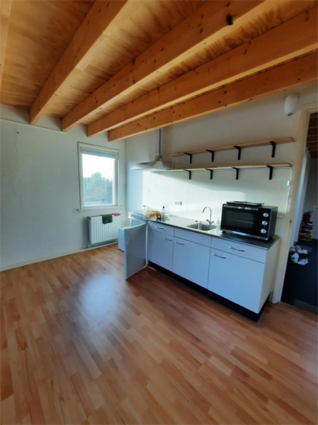 De studio ligt op de 2e etage aan de voorzijde en heeft een eigen keuken met koelkast, wastafel, fornuis en afzuigkap. De oppervlakte van de woonkamer is 28 m2. Het toilet en de gemeenschappelijke badkamer deel je met 3 personen en is voorzien van een douche en wastafel. Door de gehele studio ligt een laminaat vloer.