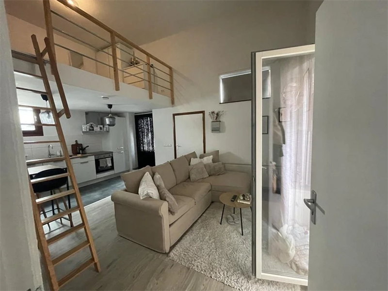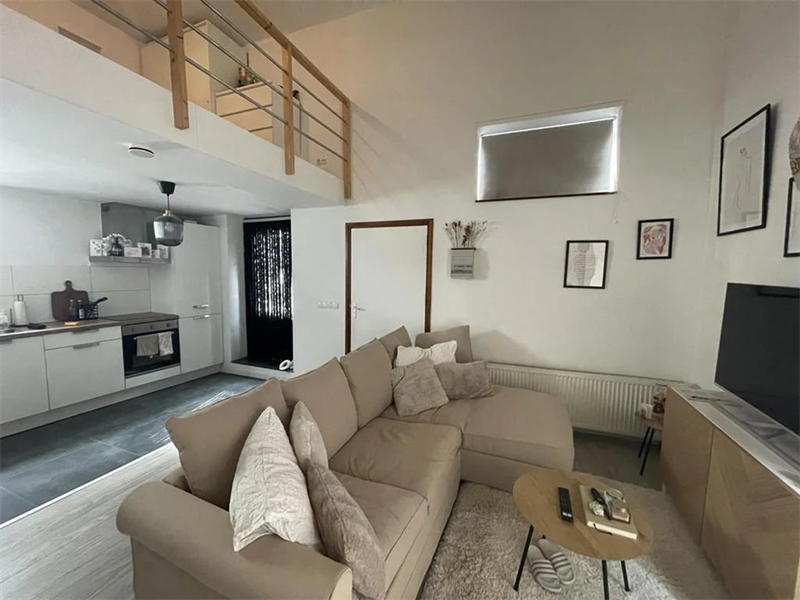 Vanuit de binnenplaats bereikt men de entree voor het appartement en de gemeenschappelijke fietsenberging. 1ste verdieping De woonkamer met open keuken (6m x 4m) is van ruime opzet en heeft een lichte laminaatvloer. De keuken is voorzien van diverse apparatuur o.a. koelkast, oven, kookplaat en een afzuigkap.Middels een vide is de slaapkamer (2,20m x 4m) gescheiden van de woonkamer.