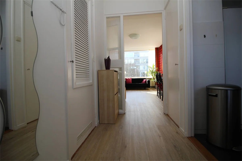 Indeling: Entree via gesloten portiek, entree appartement, ruime hal, moderne keuken met zwart graniet aanrecht, inbouw combi oven/magnetron, 4 pit gasstel, afzuigkap, vaatwasser, Amerikaans modern koelvrieskast, wasmachine en wasdroger. Moderne wc, woon- eetkamer 5,5 x 5, laminaat vloer en deur naar balkon (W), slaapkamer 3,85 x 2,85 annex moderne badkamer met inloopdouche en wastafel.