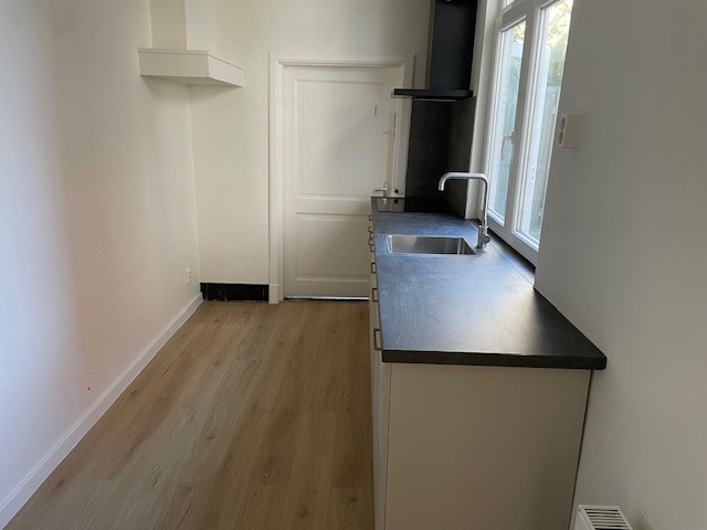 Omschrijving: De woning beschikt over een gemeenschappelijke keuken en woonkamer. De splinternieuwe keuken wordt gedeeld met drie andere bewoners. De keuken is voorzien van een koelkast met vriesvak, elektrische kookplaat en afzuiging. Op de begane grond is tevens het toilet aanwezig.