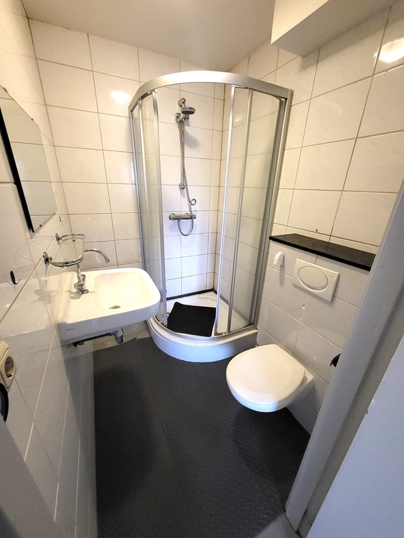 Deze studio is gelegen op de eerste verdieping aan de achterzijde met uitkijk op het het spoor en rangeerterrein. De studio is ideaal in te delen in een woon en slaapgedeelte waarbij de keuken de ruimtes splitst. Het eenvoudige keukenblok is voorzien van een 2 pits fornuis, inbouw koelkast en afzuigkap. De badkamer is voorzien van toilet, wastafel, douchecabine.