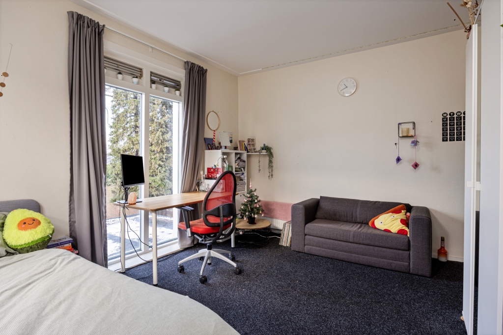 Daarnaast is er een badkamer met douche en toilet, een aparte toiletruimte en een tuin aan de achterzijde van de woning.Bijzonderheden:- Per direct beschikbaar;- Beschikaar voor 24 maanden; - Servicekosten: €86,- per maand;- Waarborgsom: één maand huur;.