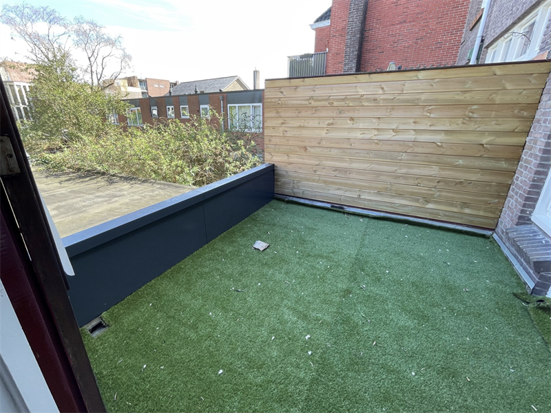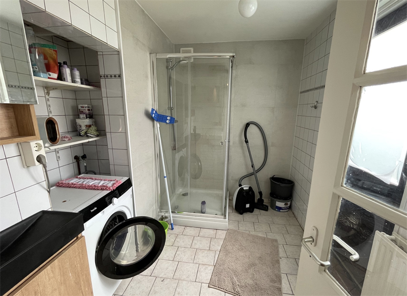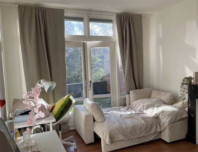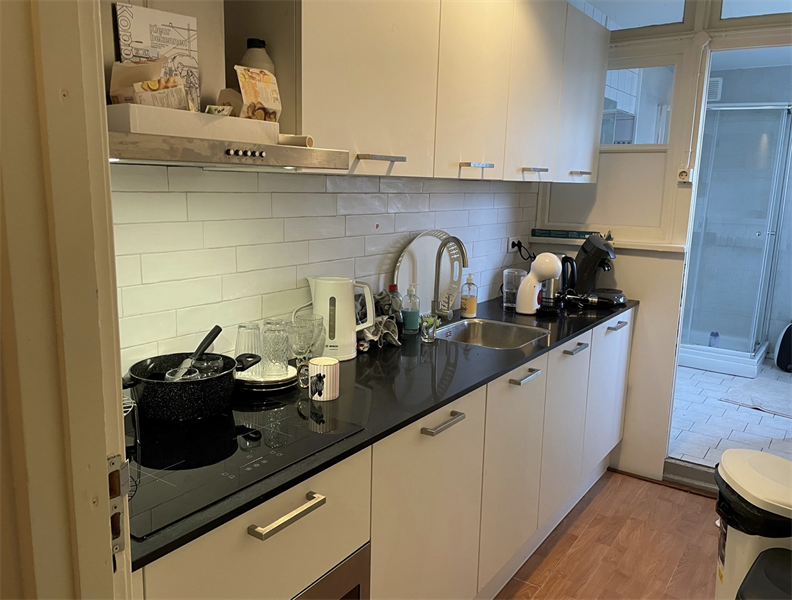 De kamer beschikt over openslaande deuren naar de gedeelde buitenruimte, die wordt gedeeld met drie andere huisgenoten. De keuken, zoals te zien op de afbeeldingen, wordt gedeeld met één andere vrouwelijke huisgenoot, evenals de badkamer en het toilet. De keuken is voorzien van diverse inbouwapparatuur, waaronder een afzuigkap, inductiekookplaat, koelkast en magnetron, en biedt voldoende kastruimte. De woning is gelegen in de binnenstad van Groningen, waardoor alle voorzieningen zich op loopafstand bevinden.