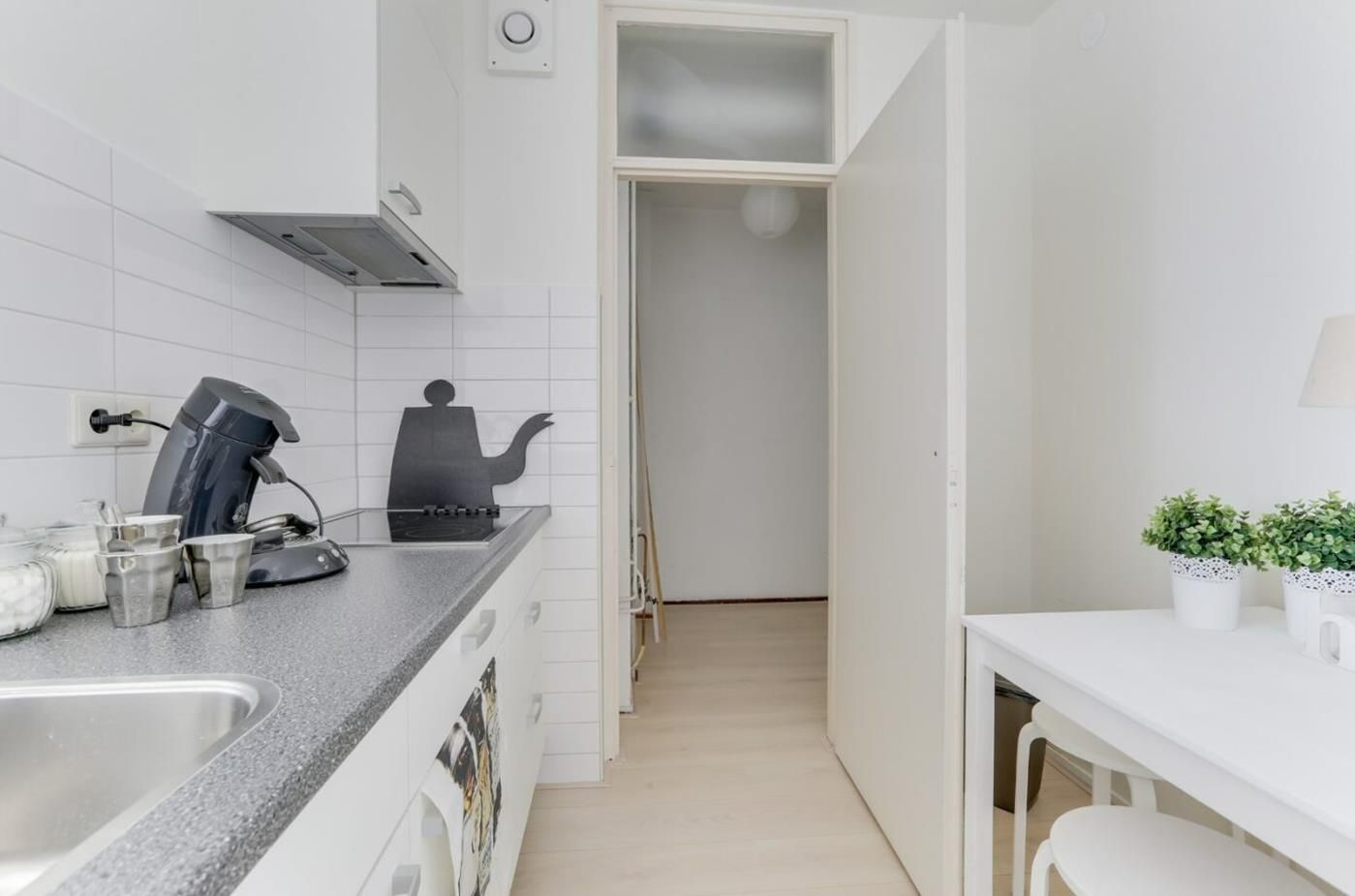 • Woonkamer met half open keuken (voorzien van kookplaat en afzuigkap)