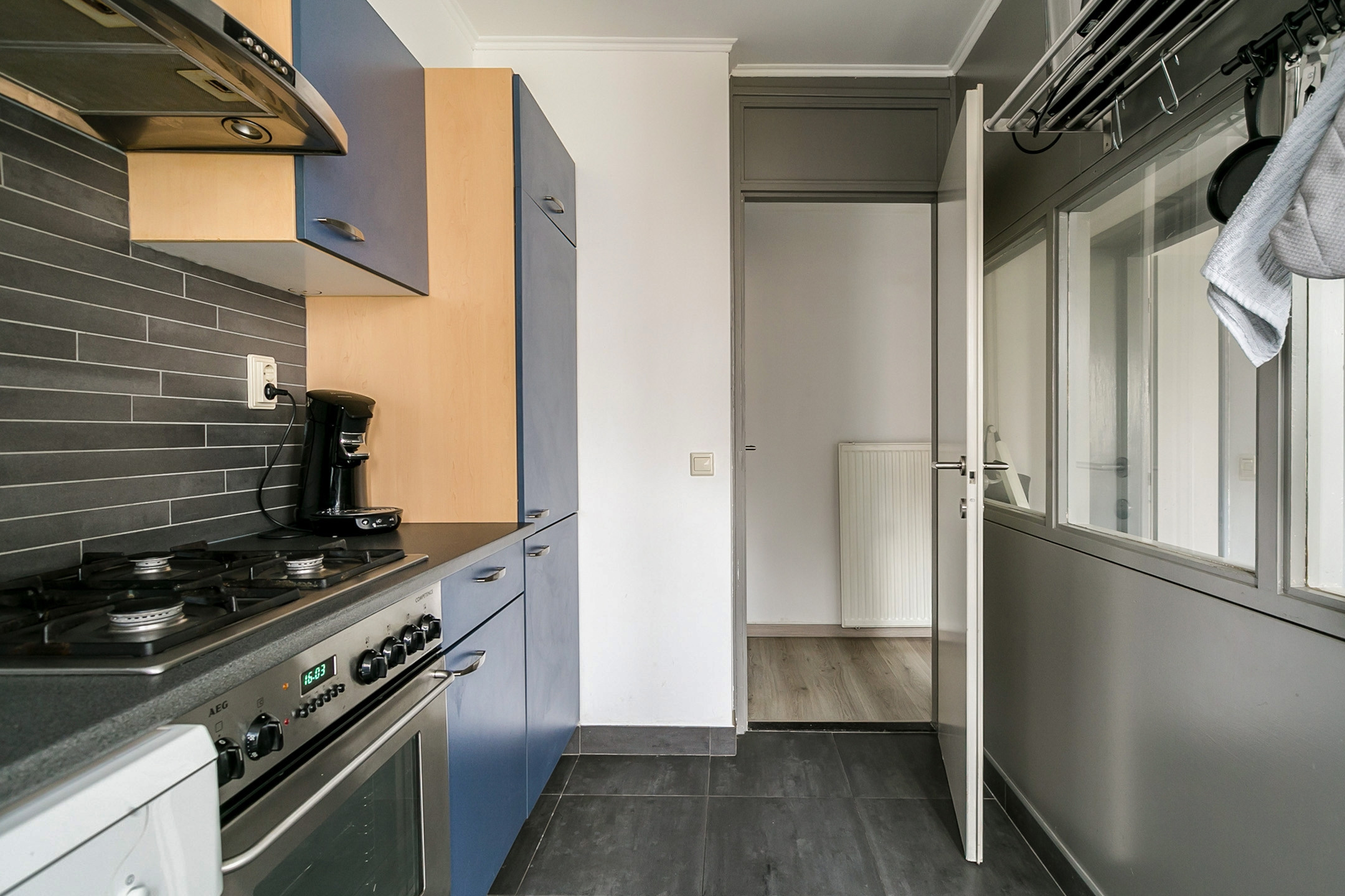 1e Verdieping: Overloop, separaat betegeld toilet in moderne uitvoering. Gesloten keuken met tegelvloer en opstelling voorzien van diverse apparatuur ; gaskookplaat, oven, koelkast, vaatwasser en afzuiging. Vanuit de keuken toegang tot een aan de voorzijde gelegen balkon. Rechte sfeervolle woonkamer met laminaatvloer, trapopgang naar de 2e verdieping en toegang tot de slaapkamer.