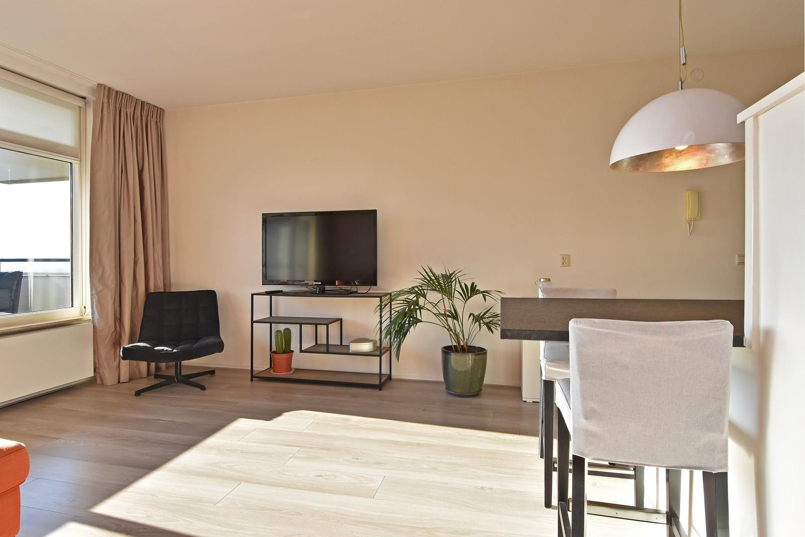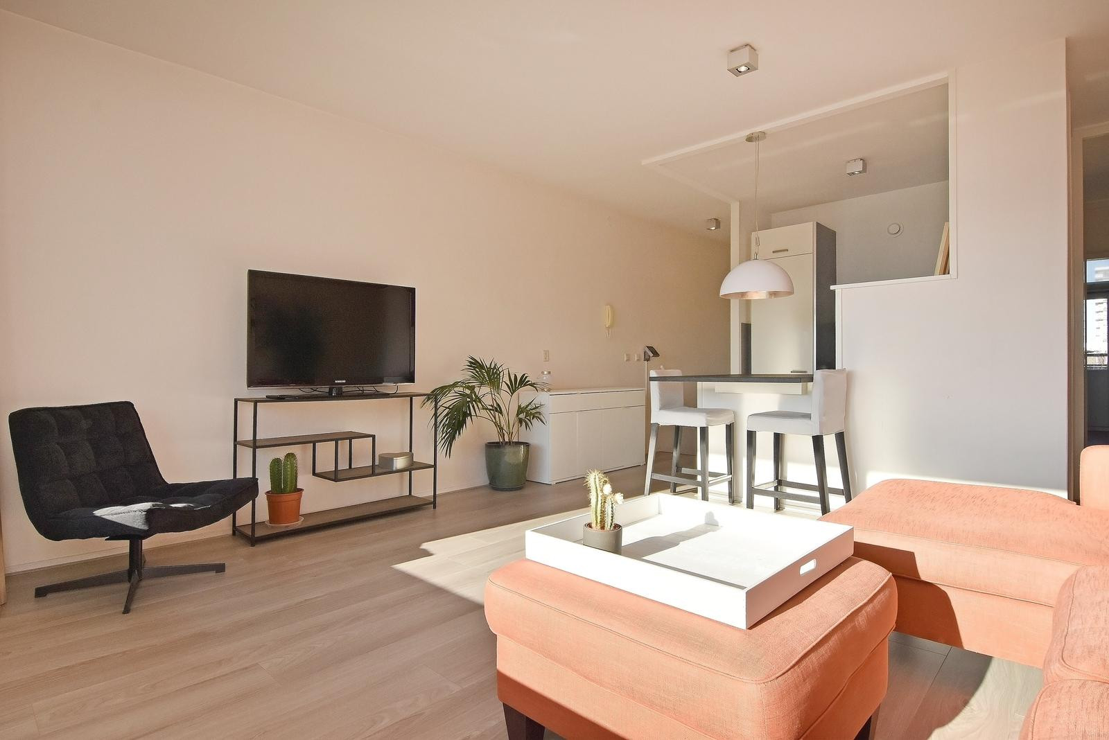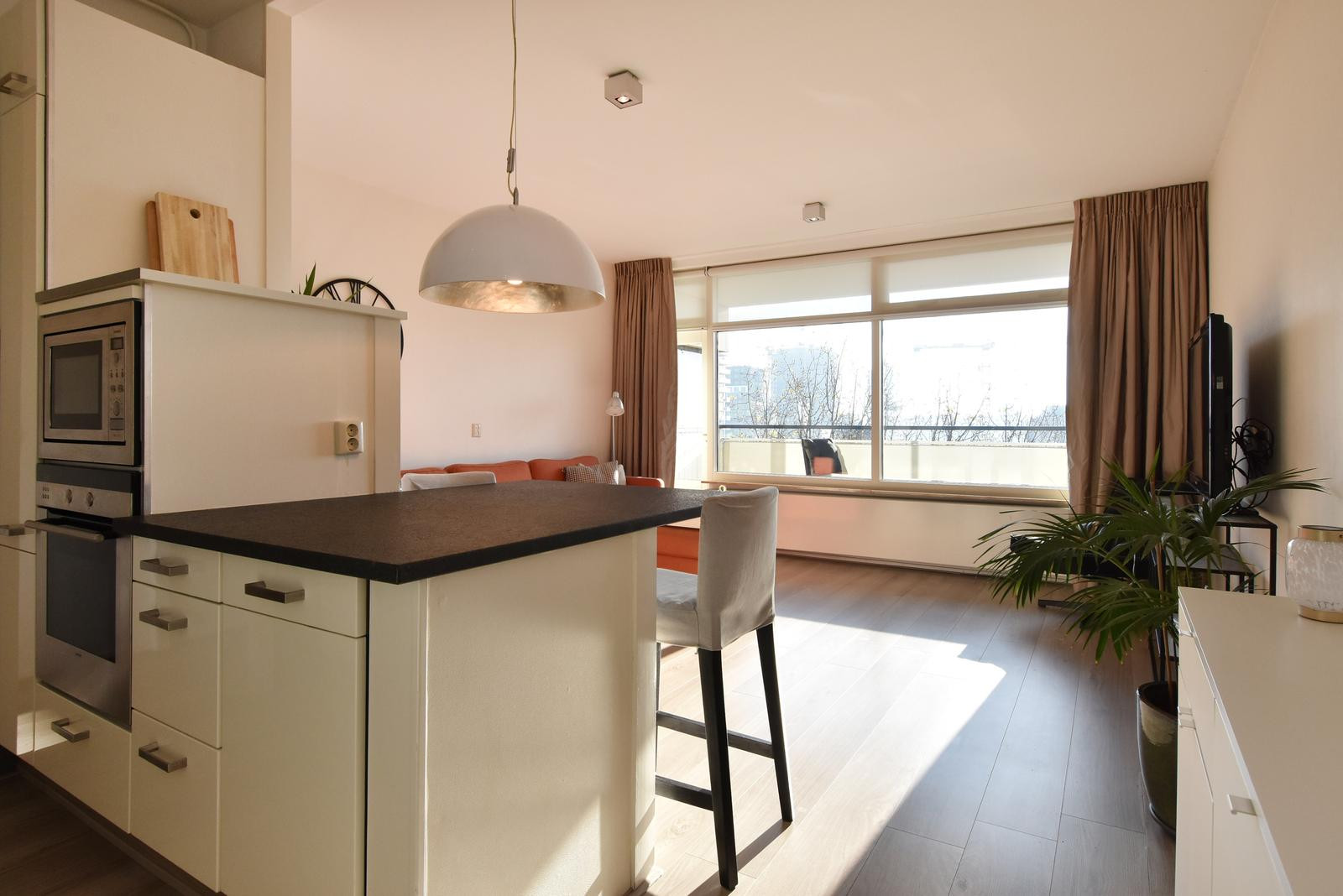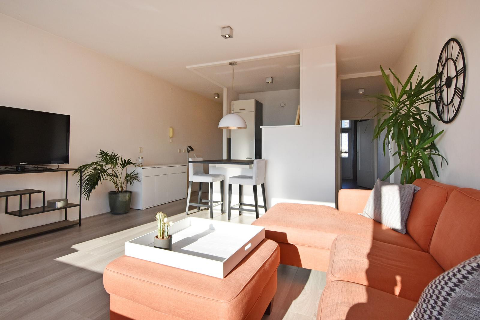 De ruime woonkamer met open keuken is smaakvol gemeubileerd en voorzien van grote raampartijen die zorgen voor veel lichtinval. De keuken is uitgerust met diverse inbouwapparatuur, waaronder een koelkast, oven, kookplaat, afzuigkap en vaatwasser. De slaapkamer biedt toegang tot het balkon aan de voorzijde en beschikt over voldoende kastruimte. De badkamer is modern afgewerkt en voorzien van een ligbad, wastafel en toilet.