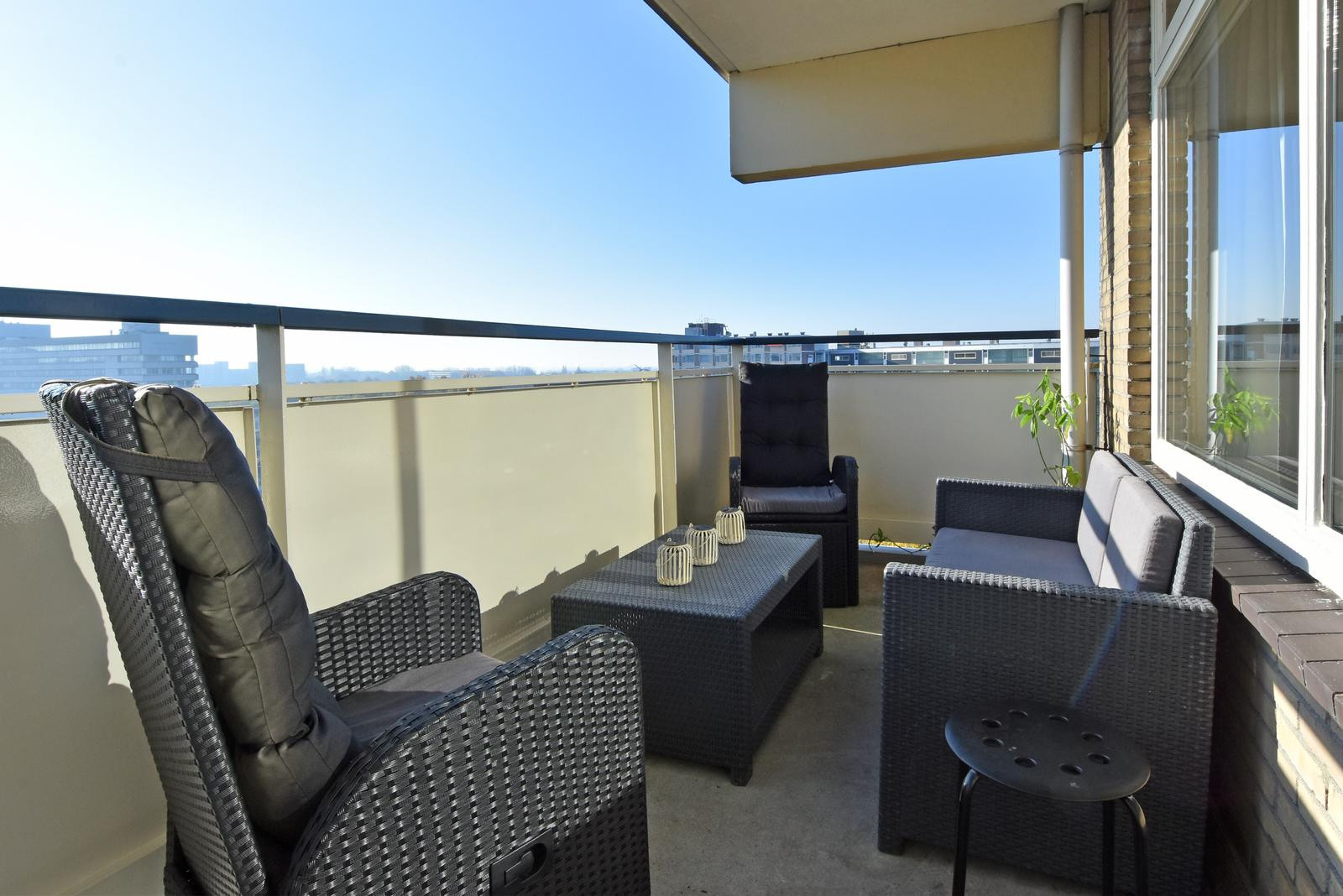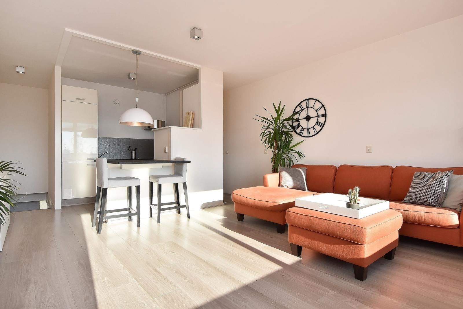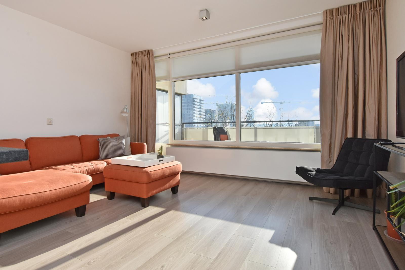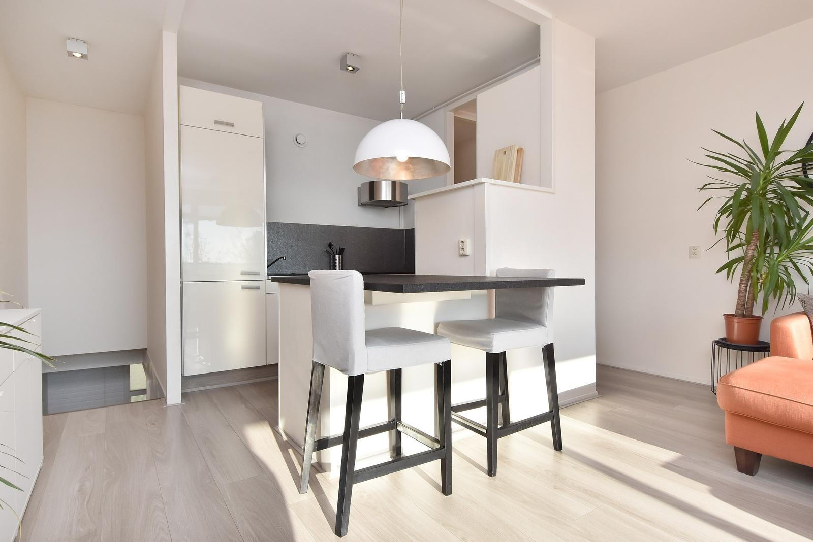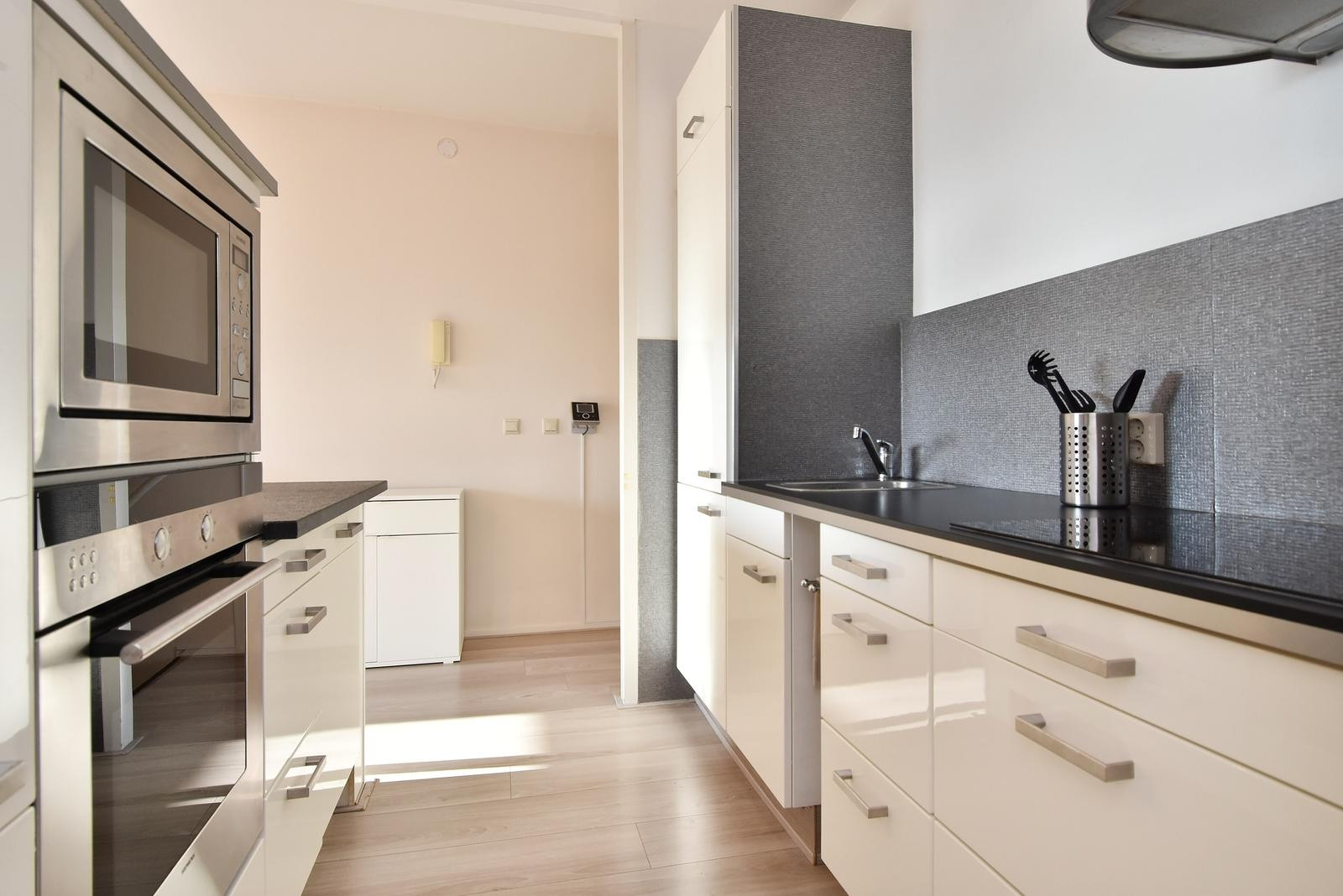 De ruime woonkamer met open keuken is smaakvol gemeubileerd en voorzien van grote raampartijen die zorgen voor veel lichtinval. De keuken is uitgerust met diverse inbouwapparatuur, waaronder een koelkast, oven, kookplaat, afzuigkap en vaatwasser. De slaapkamer biedt toegang tot het balkon aan de voorzijde en beschikt over voldoende kastruimte. De badkamer is modern afgewerkt en voorzien van een ligbad, wastafel en toilet.