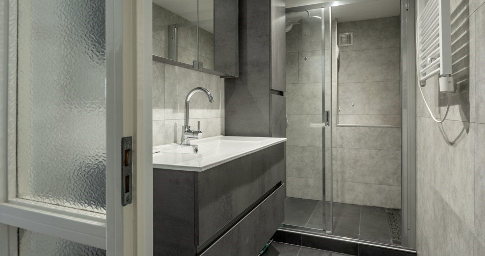 Moderne badkamer voorzien van regendouche en wastafelmeubel.