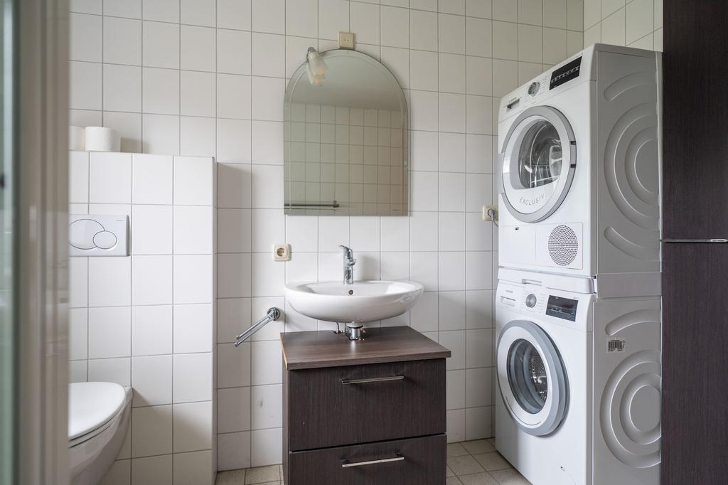 Een geheel betegelde badkamer met wasmachine en droger. Verder is de ruimte ingedeeld met een douchecabine, een zwevend closet en een wastafel welke is verwerkt in een badmeubel.