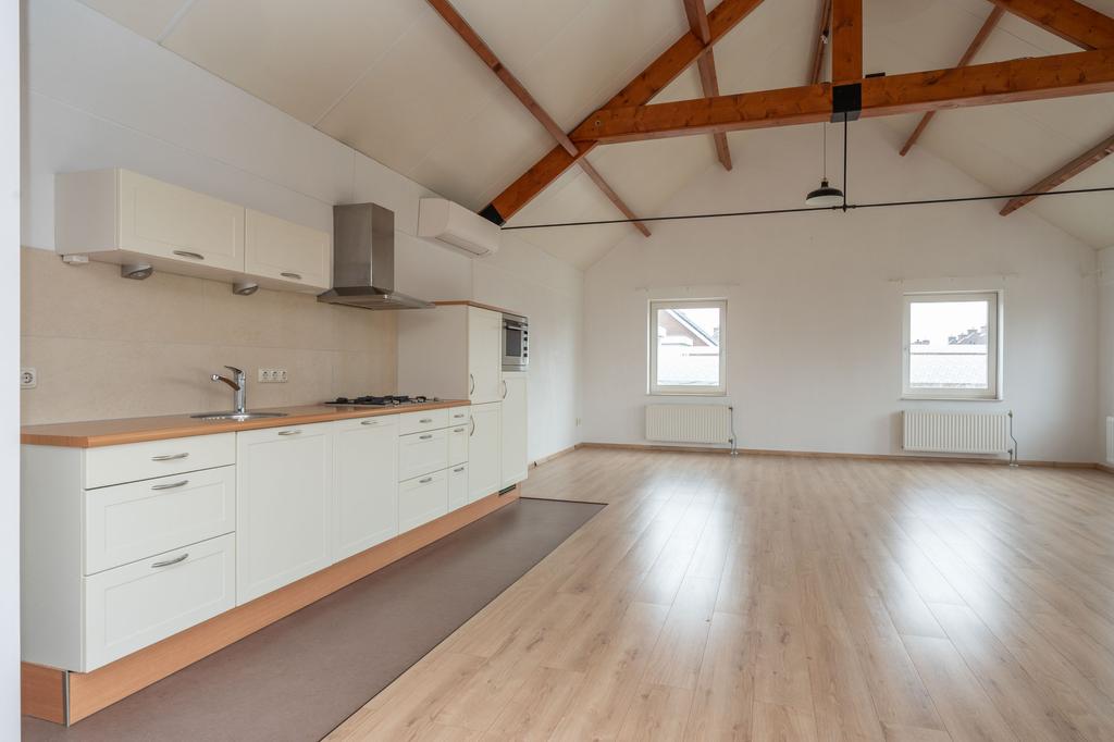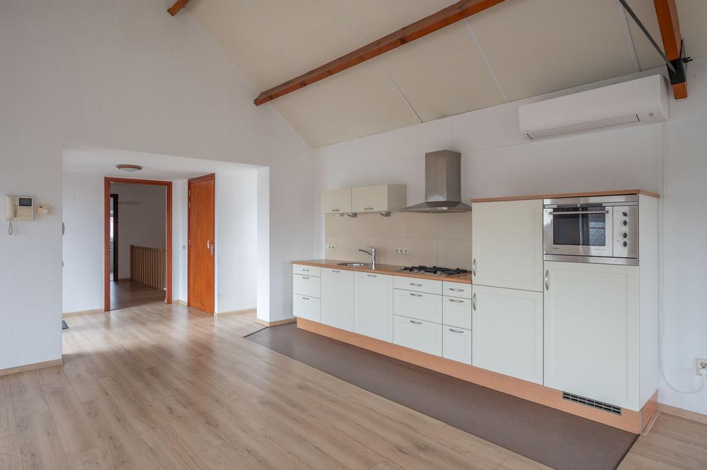 De keuken kent een open karakter waarbij de keukeninstallatie recht is opgesteld. De aanwezige inbouwapparatuur betreffen een afzuiging (op filterbasis), een 4-pits-gaskookplaat, een koelkast met vriesvak en een combi-magnetron. Tevens is er toegang tot de Cv-ruimte en het dakterras.