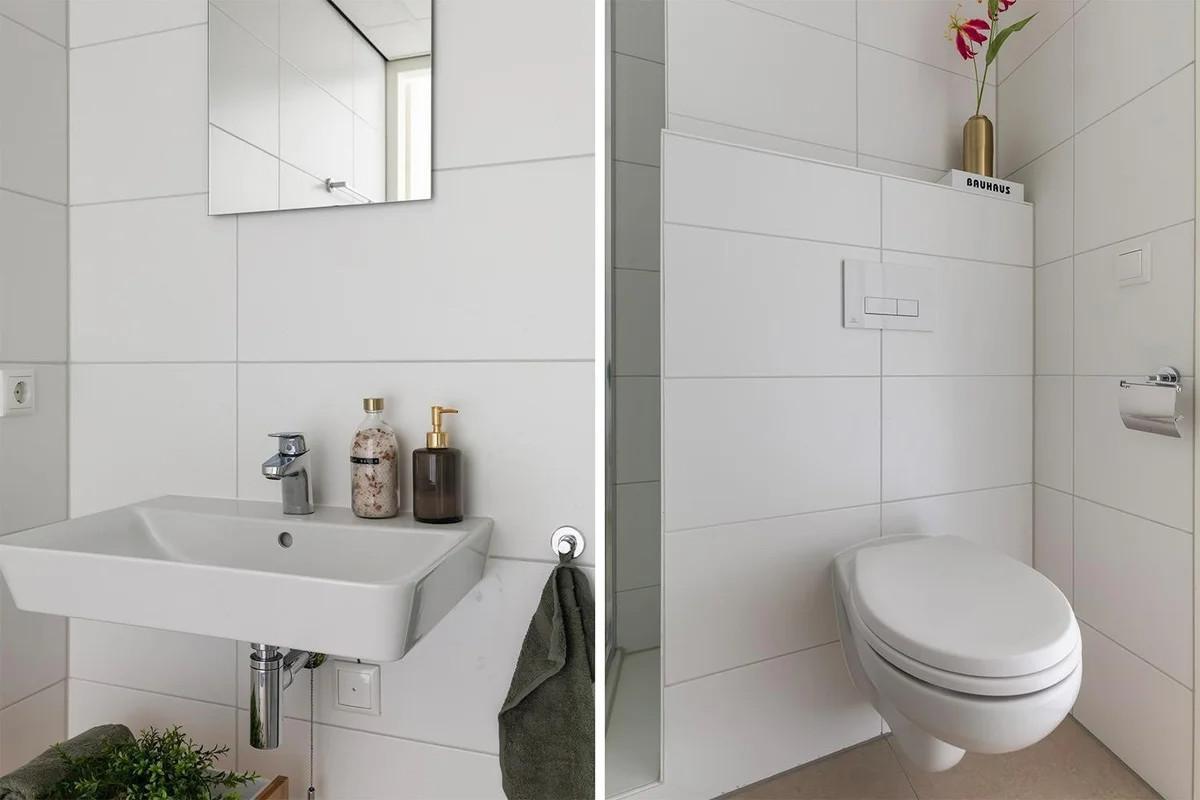 Stijlvolle badkamer voorzien van een inloopdouche, wastafel en toilet, afgewerkt in frisse, lichte kleuren.