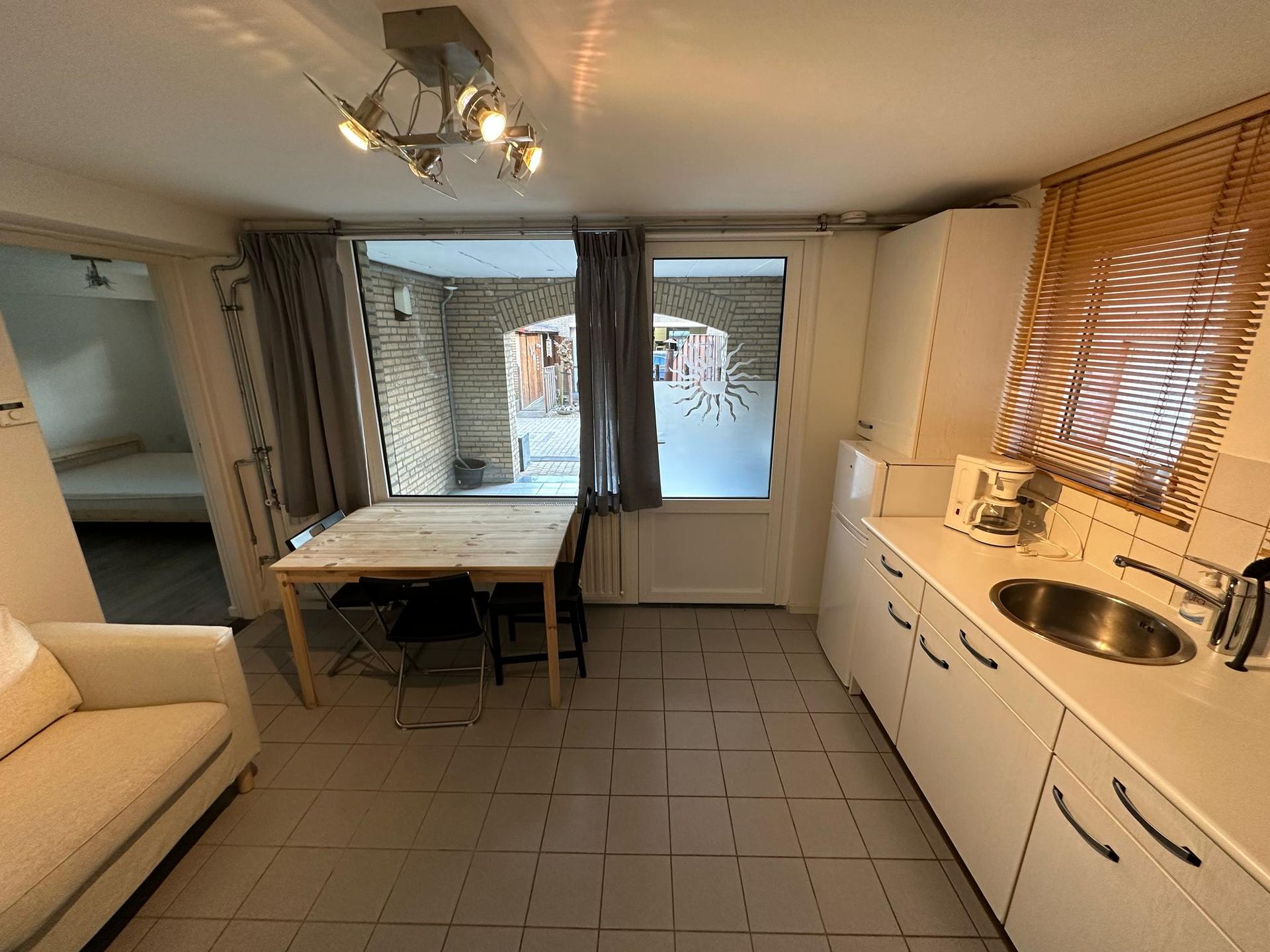 Keuken is voorzien van keukengerei, koffiezetapparaat, waterkoker, koelkast, gordijnen, keukenstoelen en tafel, een bank, verlichting etc.