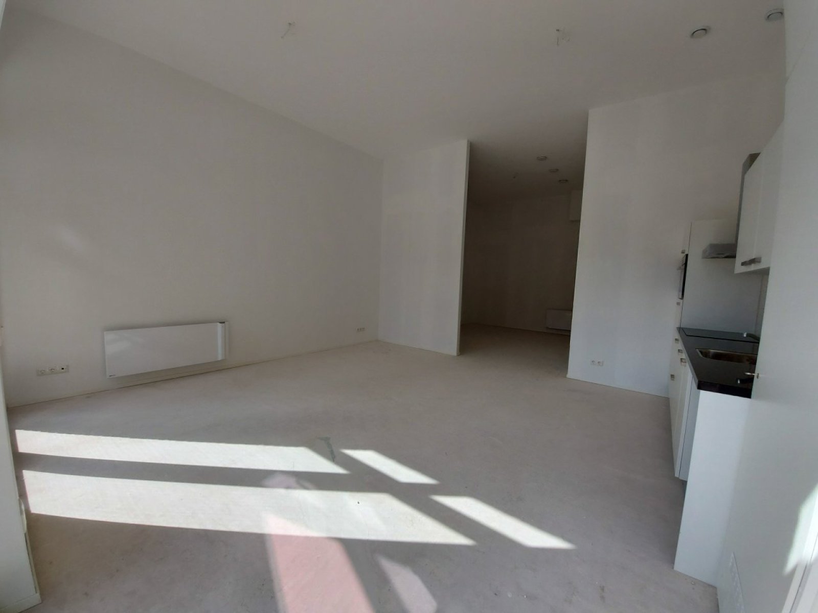 In de keuken bevindt zich ook de aansluiting voor de wasmachine. De woonkamer wordt door een wandje subtiel in twee delen opgesplitst, zodat je fijn onderscheid kunt maken tussen slapen en wonen. Of misschien heb je liever een slaapbank en gebruik je het andere deel om te werken of studeren. De badkamer is voorzien van een verfrissende douche, een wasbak en het toilet.
