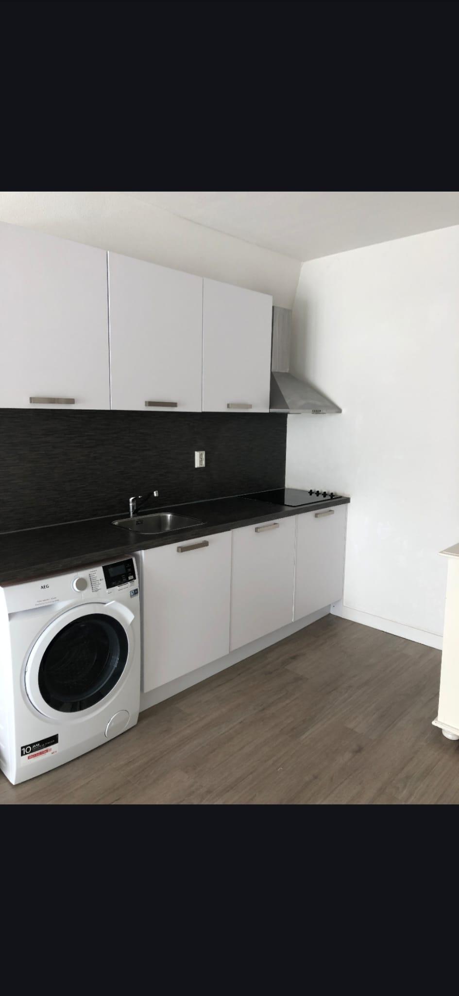 Het appartement is strak en modern afgewerkt en voorzien van een PVC-vloer, witte wanden en gordijnen. De open keuken is compleet uitgerust met een inductiekookplaat, inbouwvaatwasser en een koelkast met vriesvak.