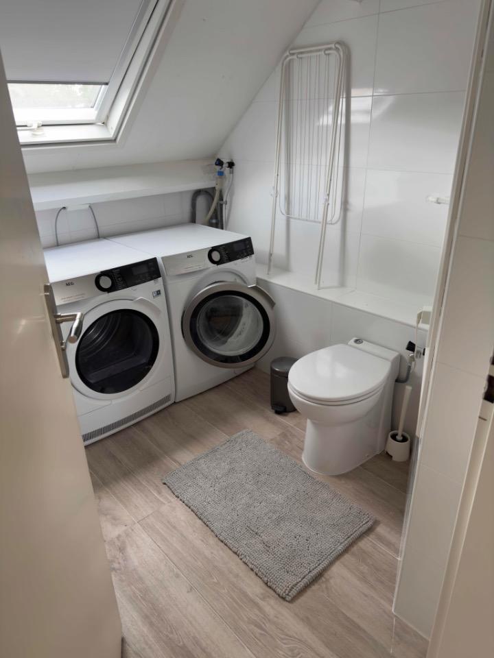 Het appartement heeft een eigen doucheruimte (4m2) met wastafel, spiegel en veluxraam. Er is een eigen eigen toiletruimte (4m2) waar ook de wasmachine en wasdroger staan. Wederom met veluxraam. Het gebruik van de wasmachine en droger is gedeeld met de huiseigenaar.