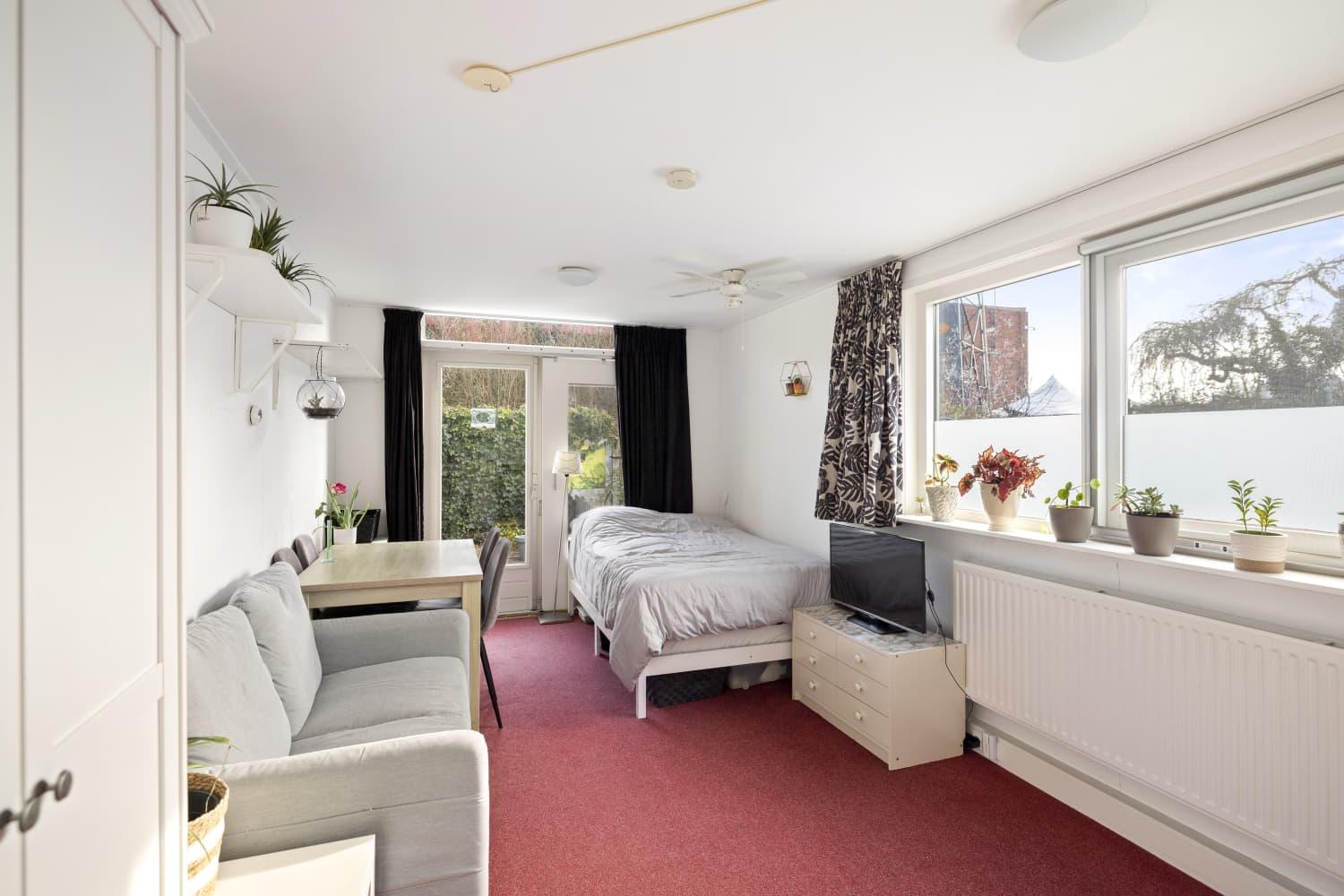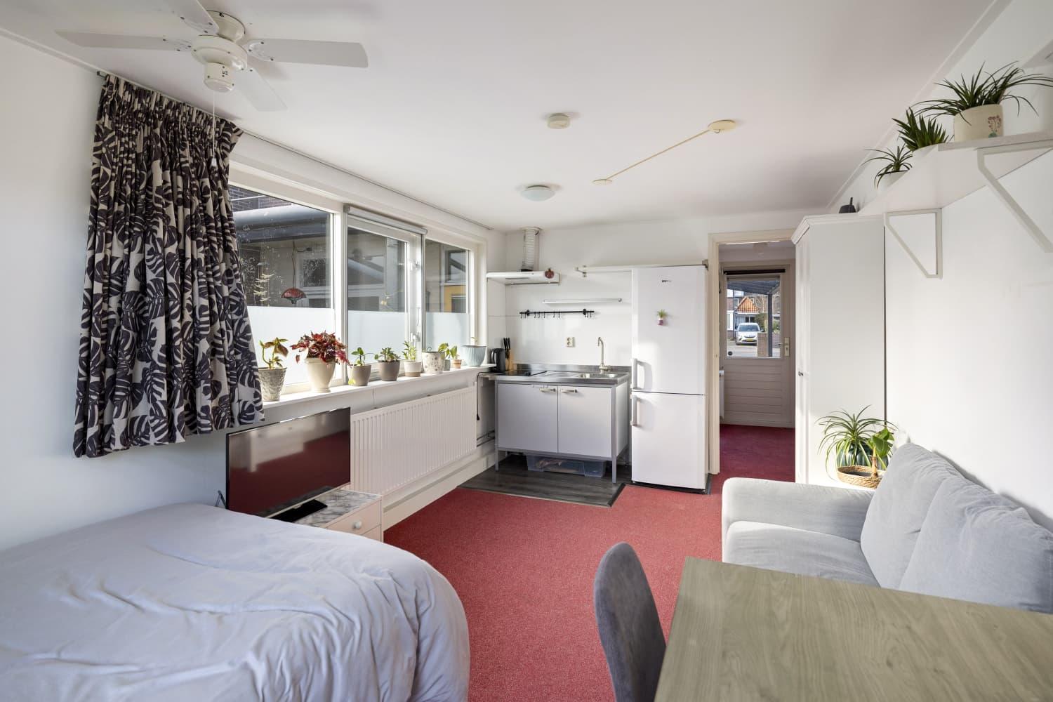 De studio heeft een eigen entree en beschikt over een open woon-/slaapruimte met keuken, een eigen badkamer en centrale verwarming (cv). De ruimte is gestoffeerd; er zijn een koelkast en een tafel aanwezig. Internet is beschikbaar.
