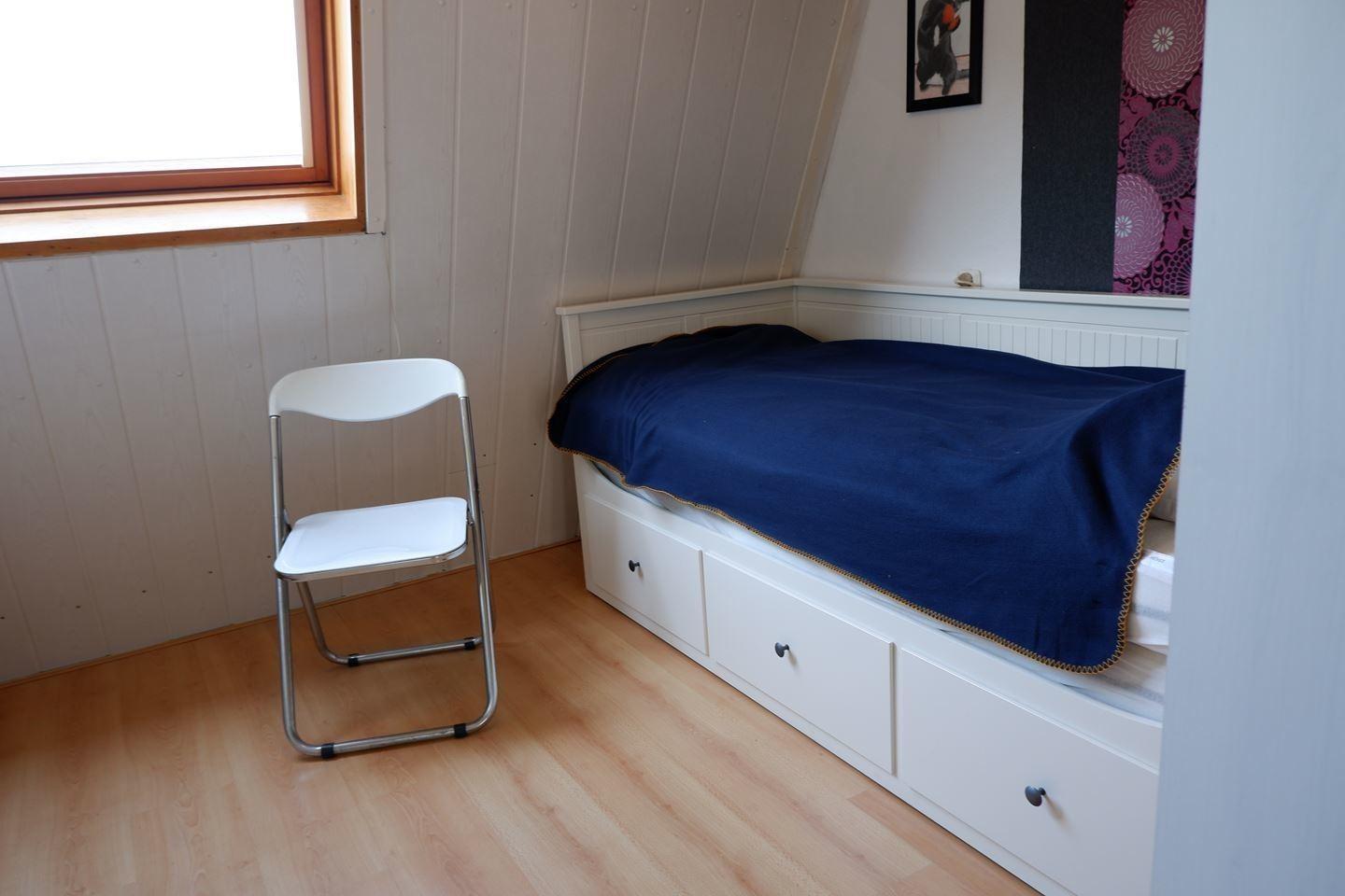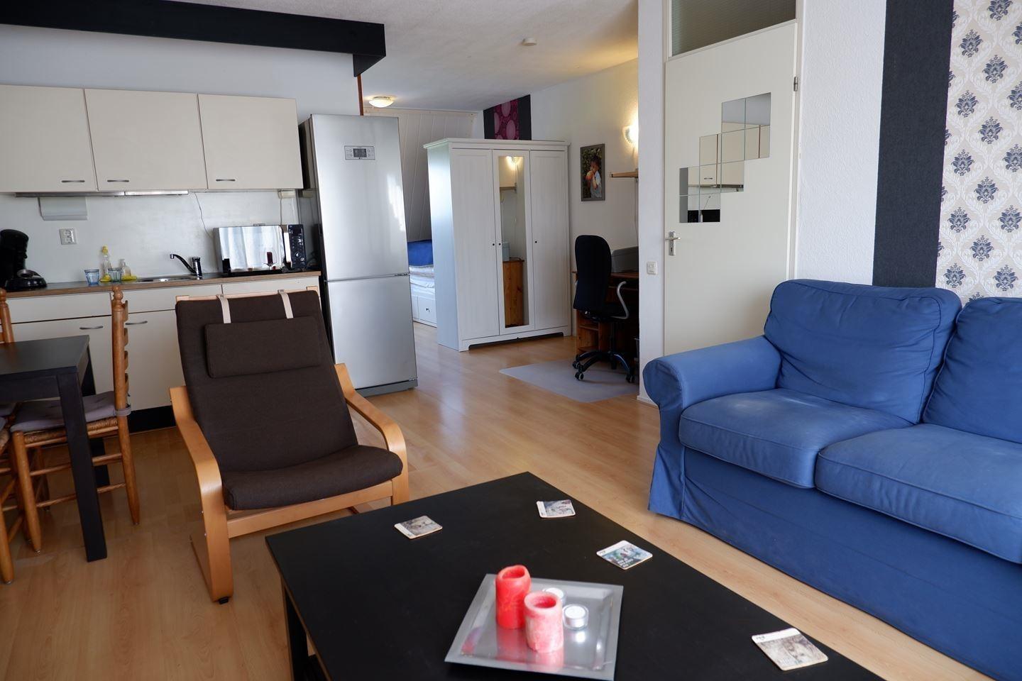 30 m2) met een afgeschermde slaap-nis (kan middels een scheidingswand een slaapkamer worden. Tussenhal, stookruimte/berging, nette doucheruimte met het toilet gecombineerd, douchecabine, wasmachineaansluiting en wastafel.
