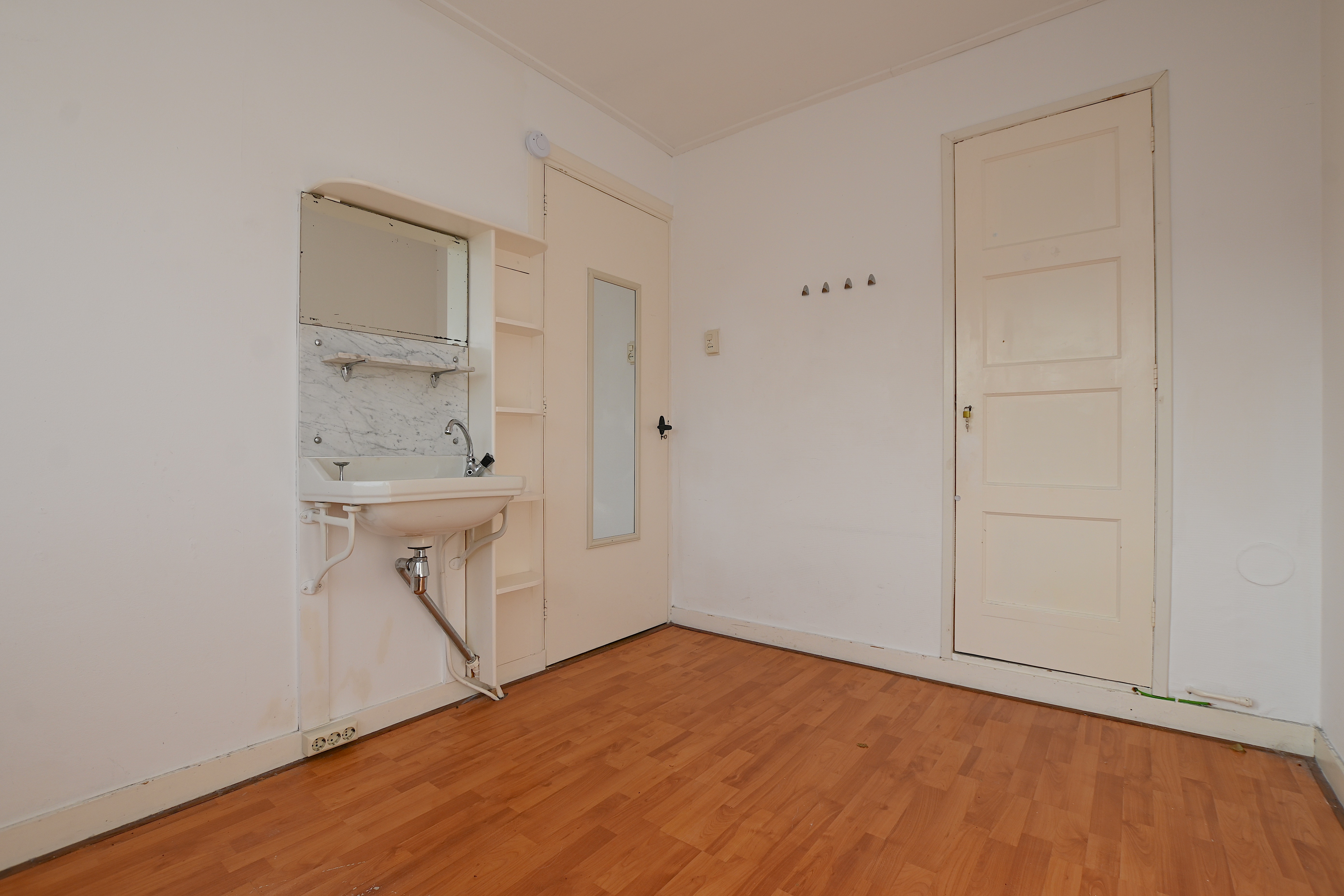 De kamer heeft een oppervlakte van circa 8m2 en beschikt over een inbouwkast en een wastafel met spiegel.