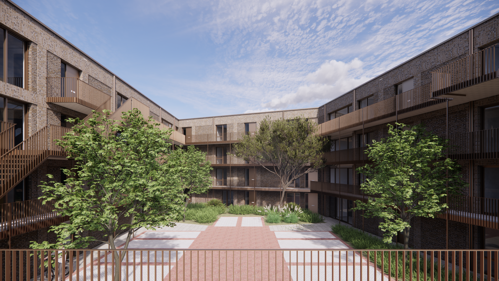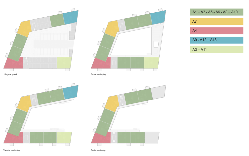 De eerste en tweede verdieping tellen ieder 10 appartementen en op de bovenste verdieping bevinden zich 8 appartementen. De appartementen op de verdiepingen beschikken over een balkon van circa 5 m².Elk appartement heeft een lichte woonkamer met open keuken, twee slaapkamers en een badkamer met douche en toilet. Op de begane grond heeft ieder appartement een eigen berging van circa 5 m2. Als eerste bewoner krijgt u bovendien de mogelijkheid om zelf een keuken uit te kiezen. Het gebouw is voorzien van een lift en de algemene ruimtes hebben automatische deuren.