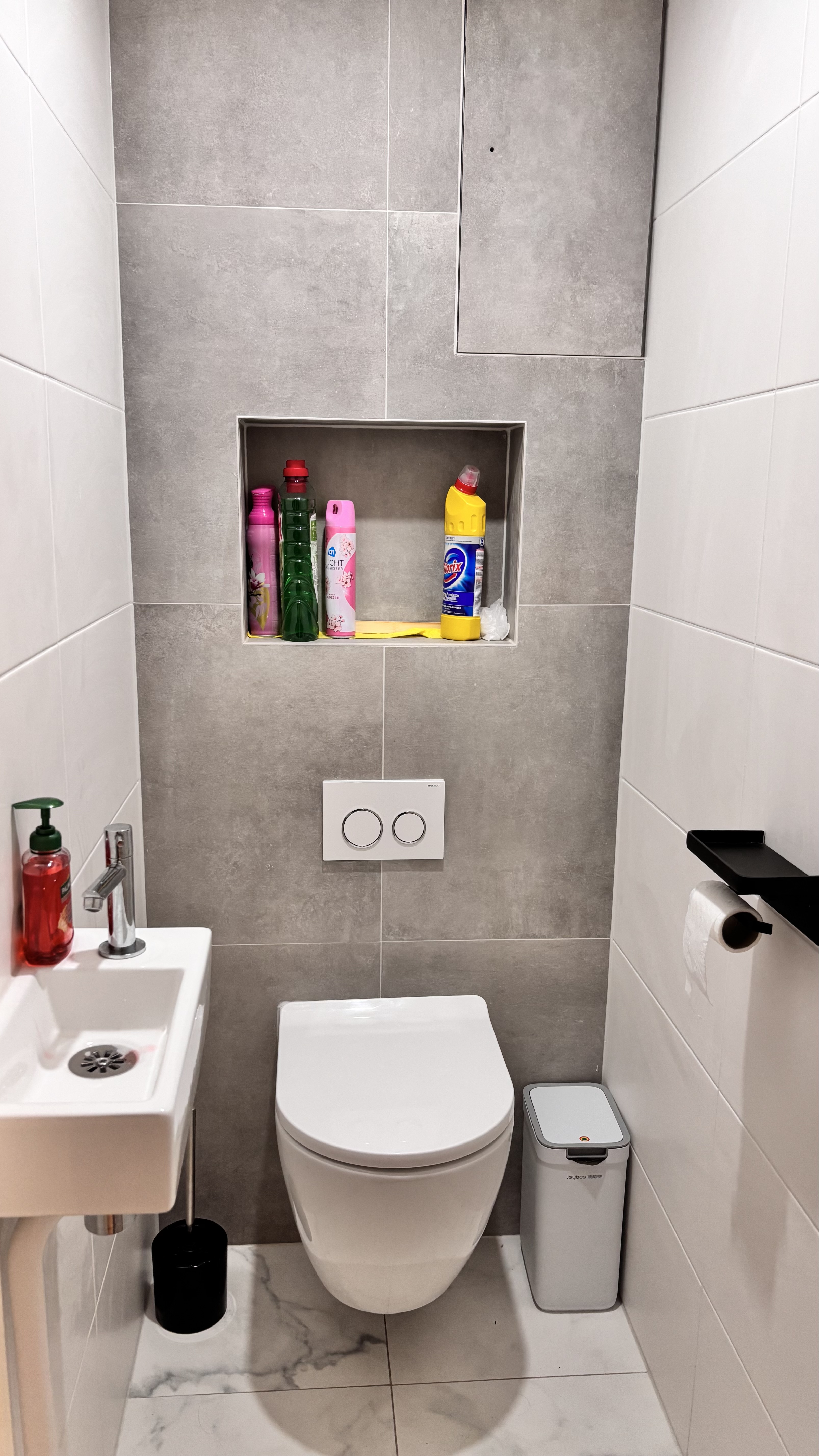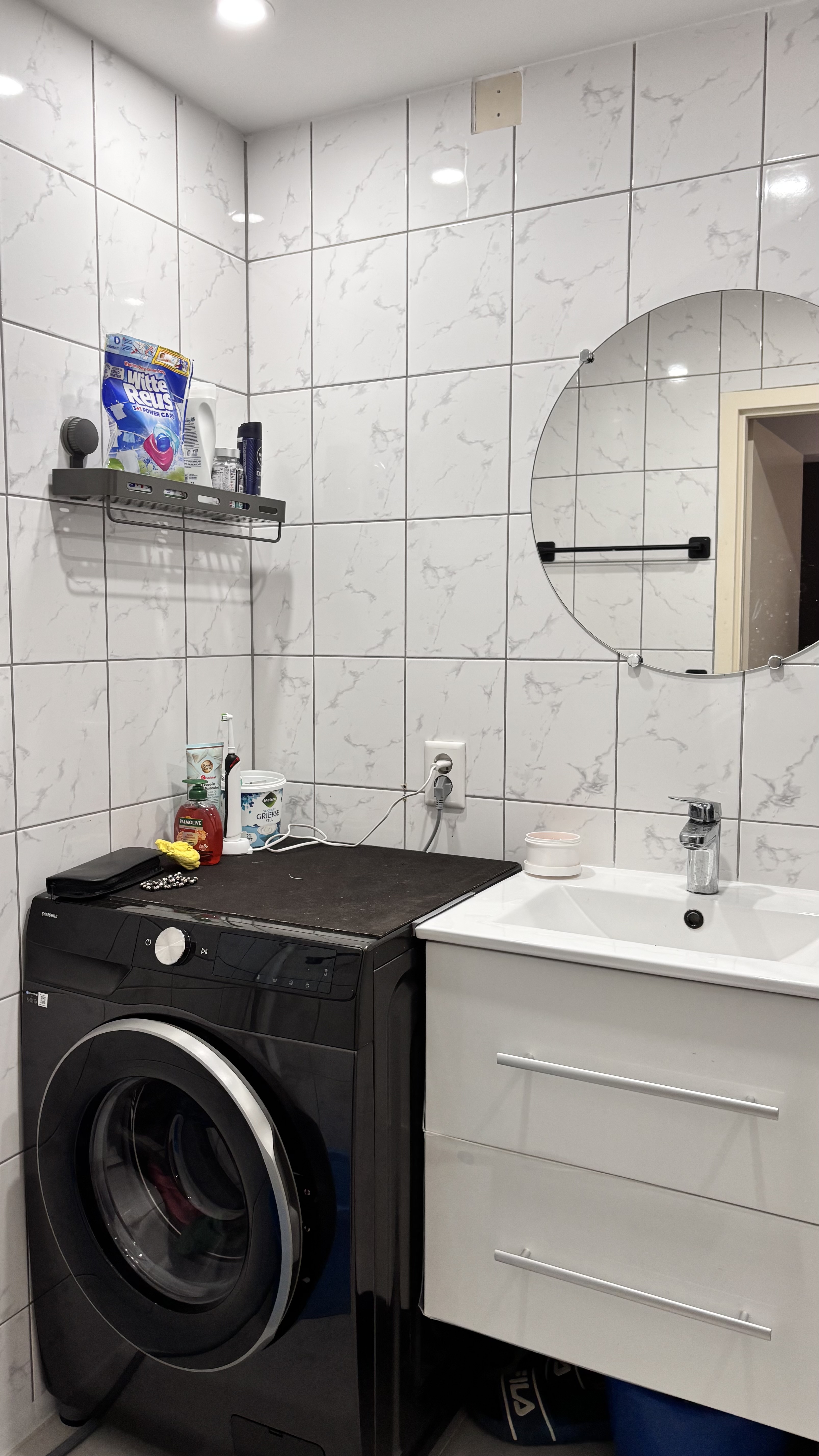 • Betegelde badkamer met douche, wastafel en wasmachineaansluiting