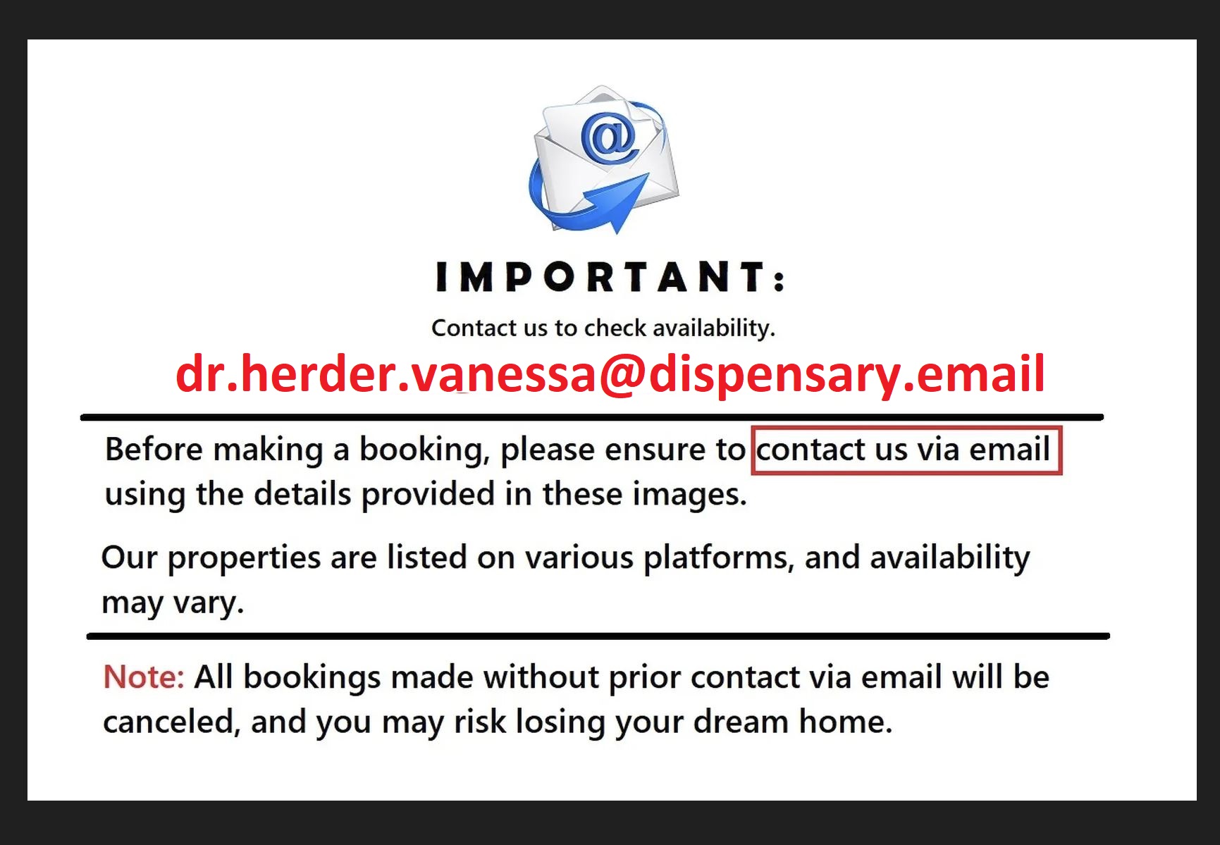 Neem rechtstreeks contact met mij op via: dr.herder.vanessa@dispensary.email. Zie afbeelding 2! Ik stuur u graag meer foto's en details over het appartement! Vermeld daarbij in welk appartement u geïnteresseerd bent.