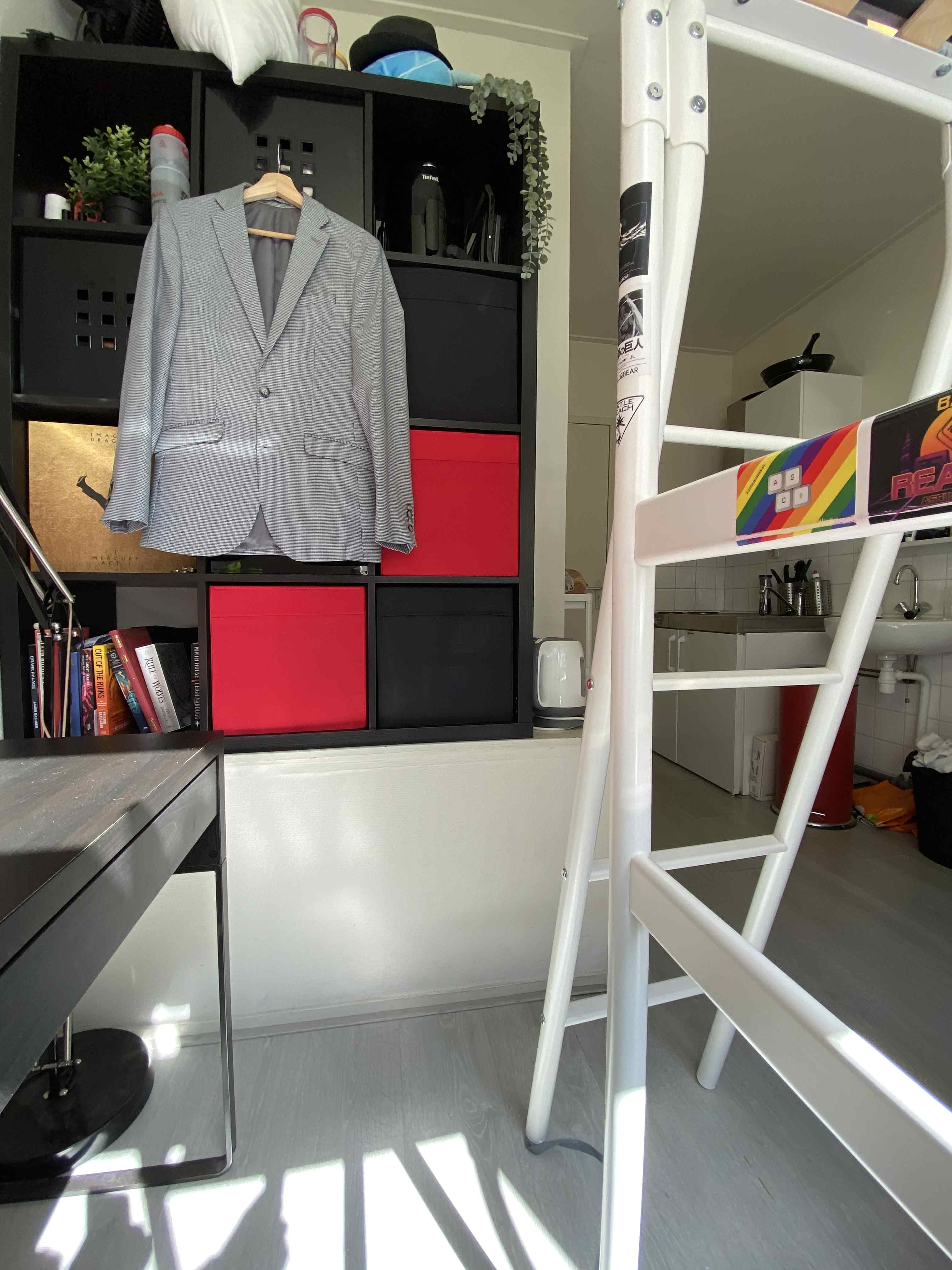 Het is ca. 10m² en gesitueerd op de tweede etage van het complex. De kamer beschikt over eigen keuken, wastafel en vloerverwarming. De douche en toilet deel je met de medebewoners net zoals de binnenplaats.
