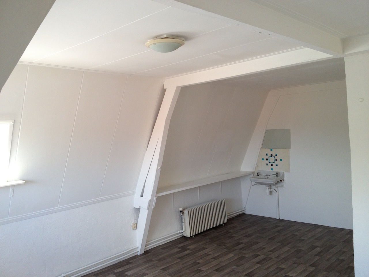 Laminaatvloer, rolgordijn en wasbak. De kamer is in het centrum van het Ginneken.