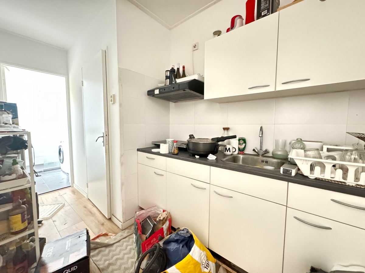 Bij binnenkomst betreed je direct de moderne, open keuken die naadloos overgaat in de lichte woonkamer. De keuken is volledig nieuw en uitgerust met hoogwaardige apparatuur zoals een koelkast, inductiekookplaat en afzuigkap. De woonkamer biedt een aangename, rechthoekige ruimte met hoge plafonds die zorgen voor een ruimtelijk gevoel. Dankzij de grote ramen is er volop natuurlijk licht en goede ventilatiemogelijkheden.