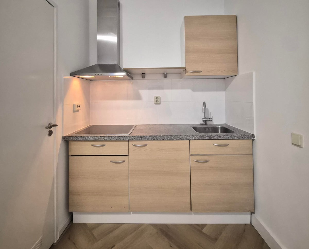 Gemeenschappelijke entree op straatniveau met de privé voordeur van het appartement op de 1e etage voorzijde. U komt binnen in de heerlijk lichte woonkamer met sfeervolle erker. Moderne open keuken met ingebouwde 4-pits gas kookplaat, koelkast met vriesvakje en combimagnetron.