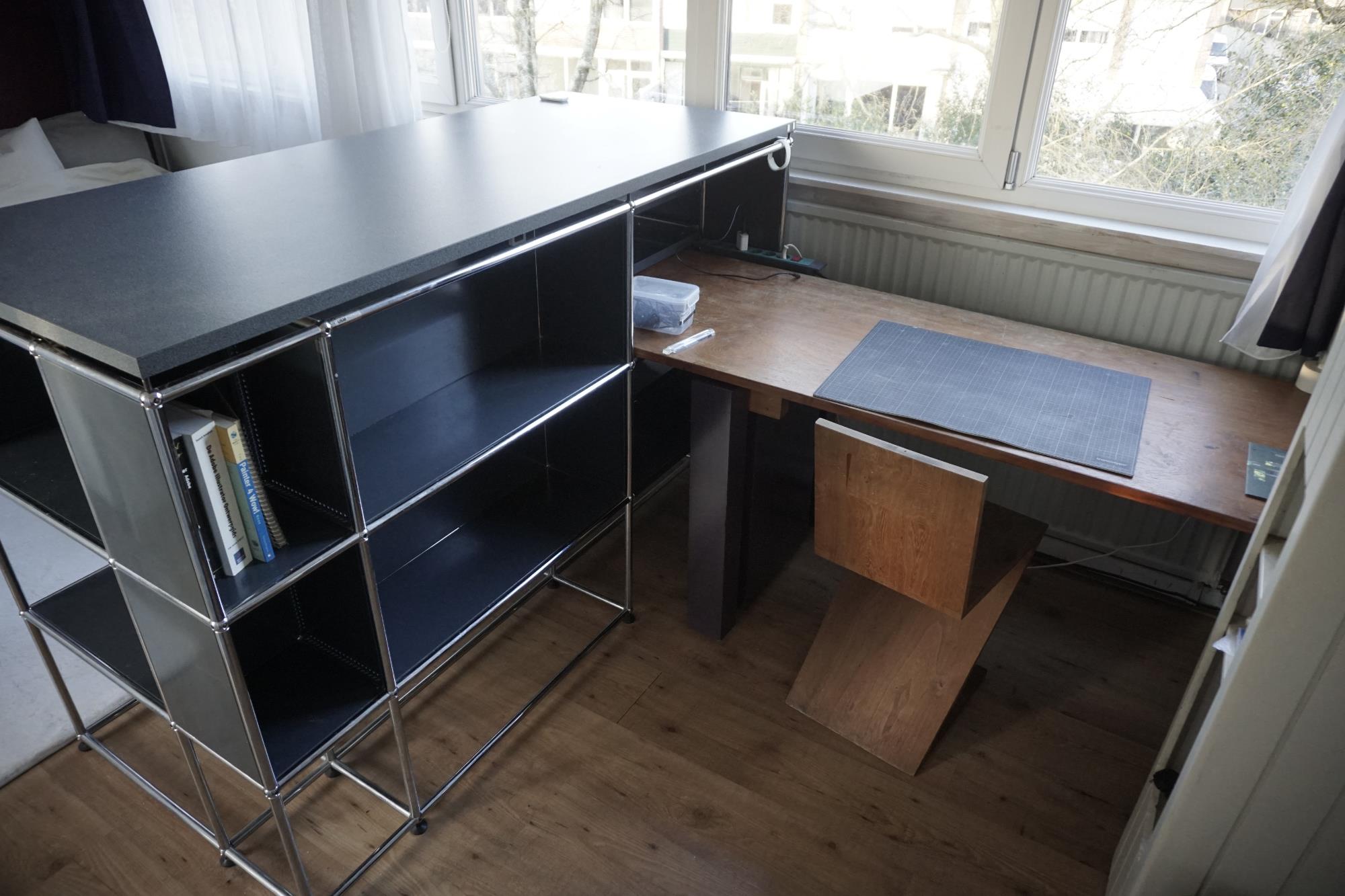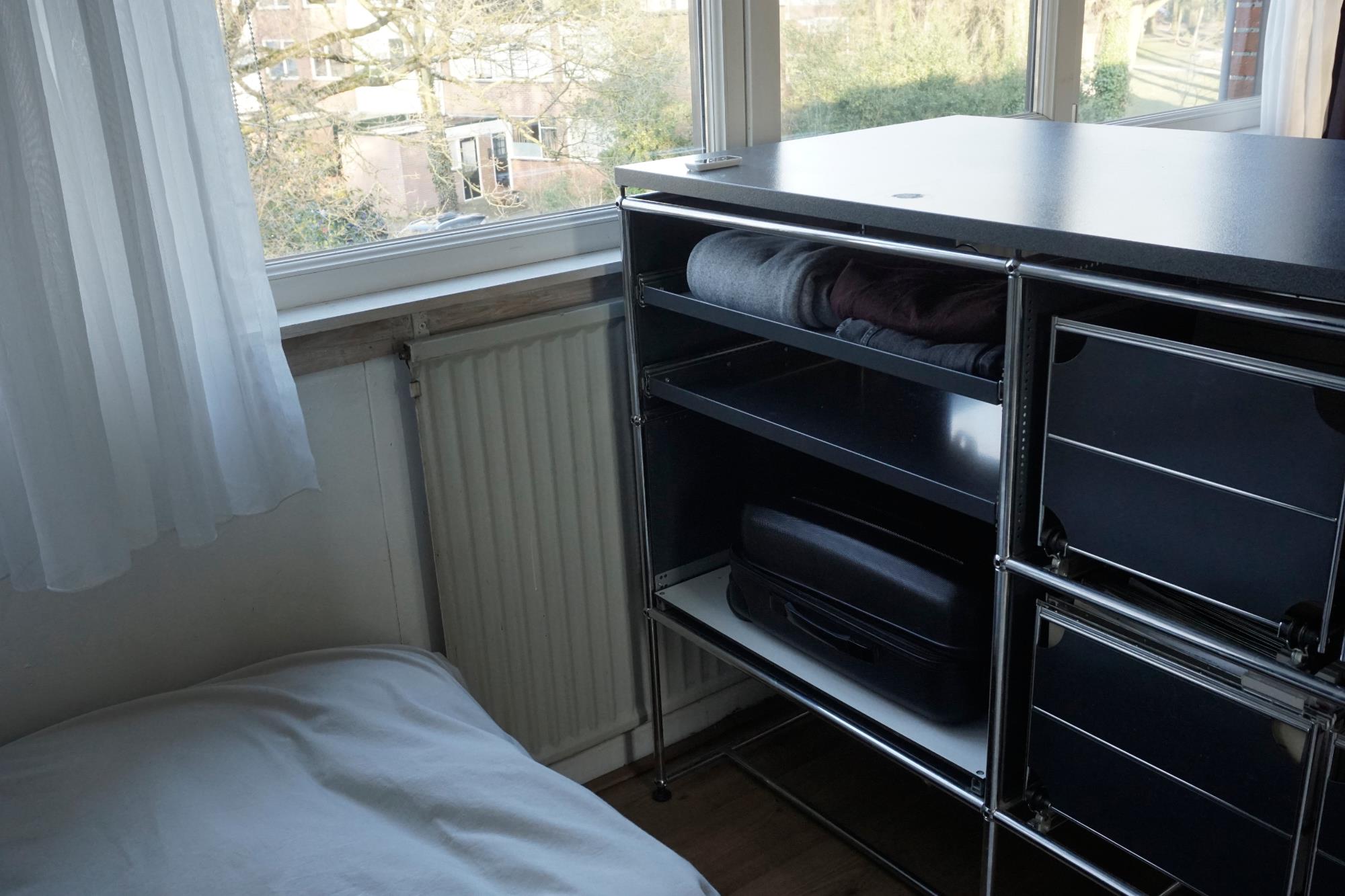 • Grote kast met aflegblad, drie lades (waarvan één voor een vliegkoffer), extra ruimte voor boeken/spullen