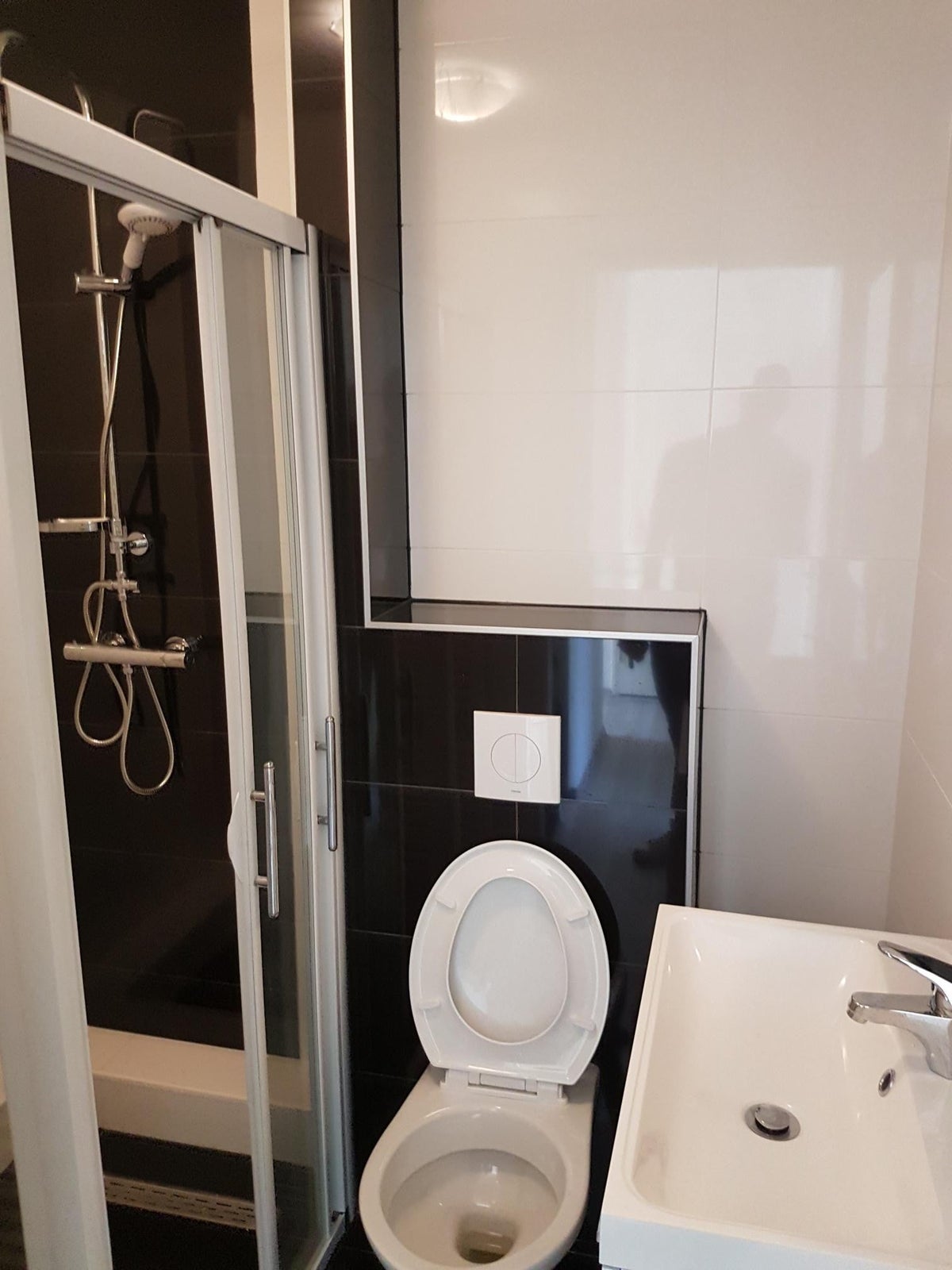 De gemeenschappelijke badkamer is voorzien van een douchecabine, wastafel met wastafel, spiegel met verlichting en toilet.