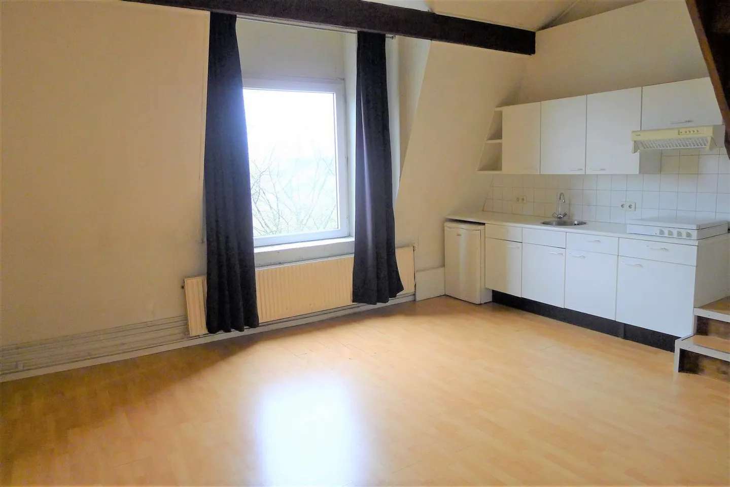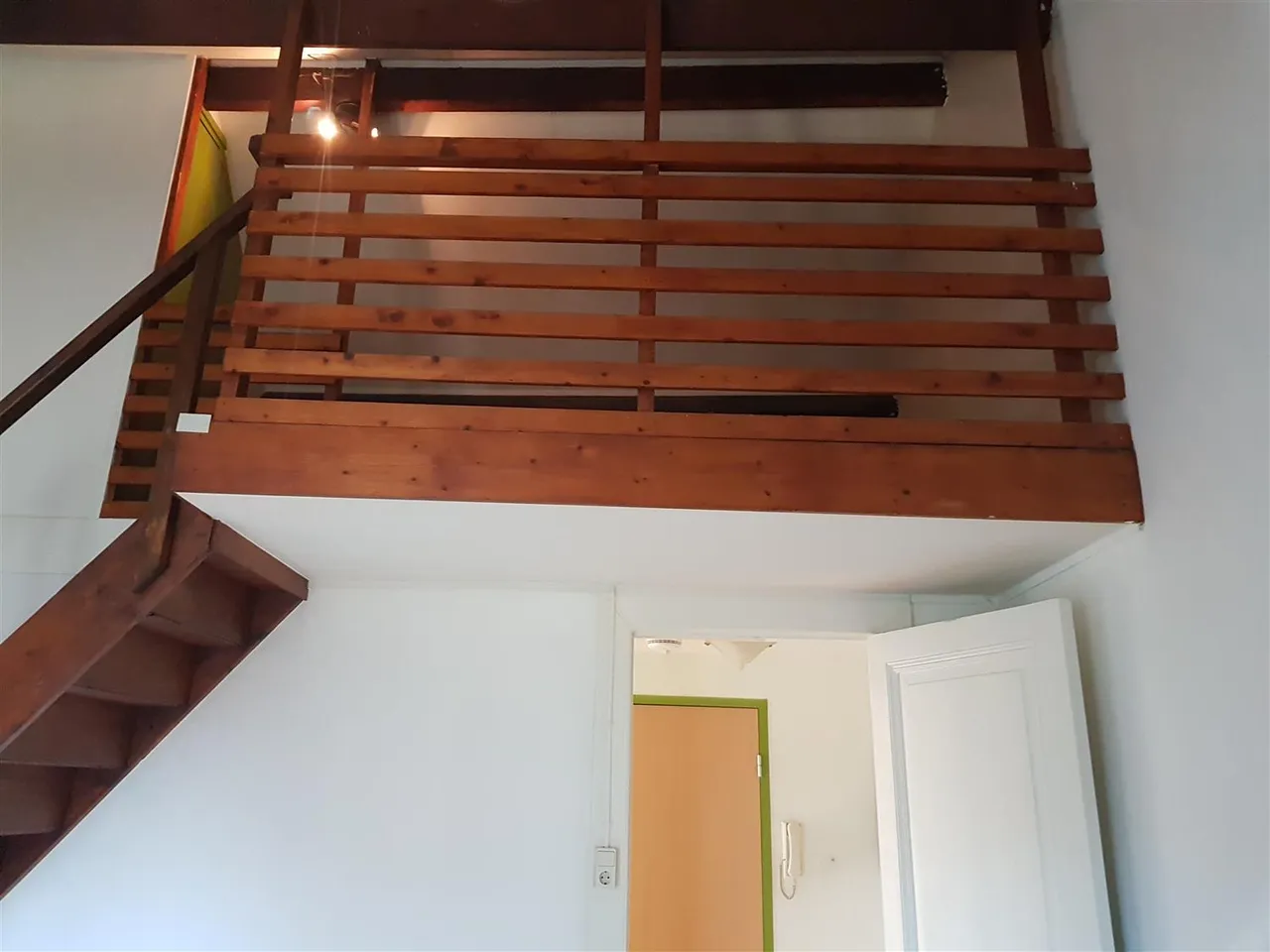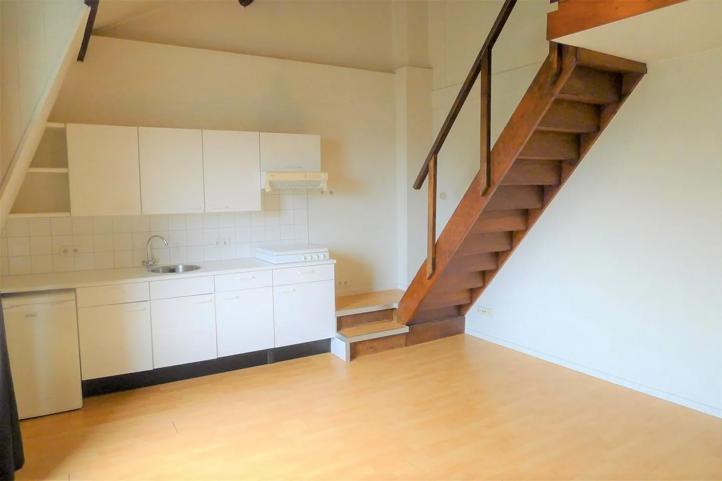 The apartment consists of a hallway with access to the living room with open kitchen (including hob and fridge) with open loft, bedroom at the rear and a bathroom with shower, sink and toilet. Suitable for a couple.