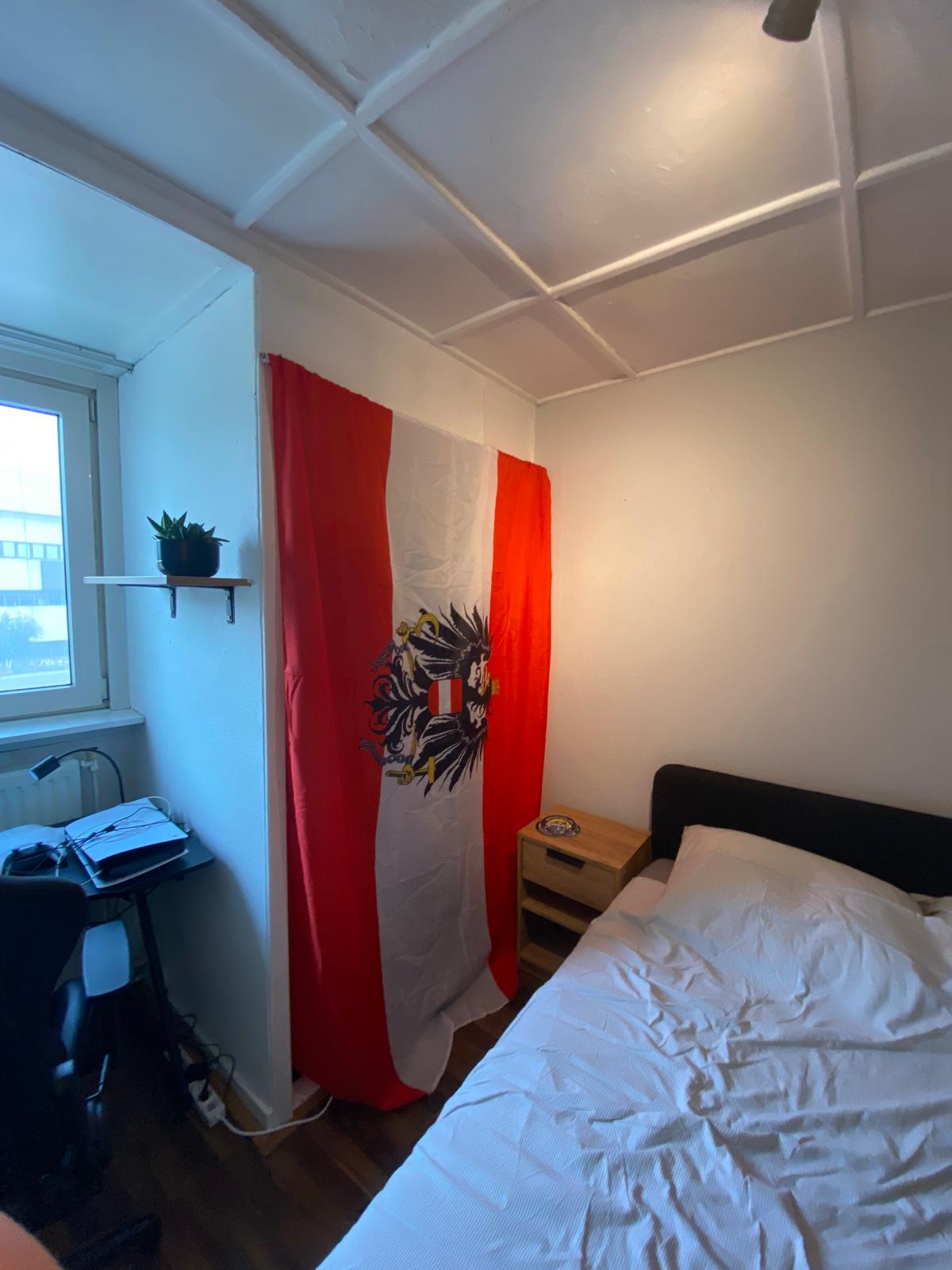 De beschikbare kamer is ongeveer 14m2 met een wastafel en spiegel, voor 320 euro per maand.